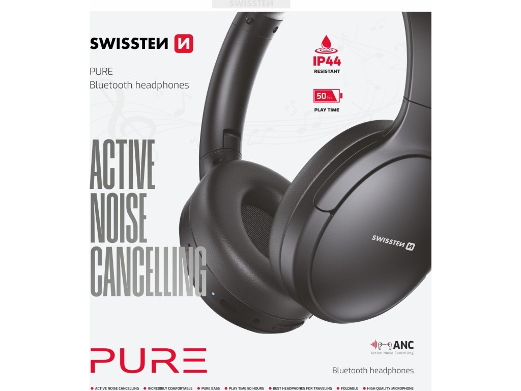Swissten Bluetooth ANC Sluchátka PURE, kvalitní a čistý zvuk s potlačením okolního šumu a hluku, Verze Bluetooth: 5.3, Kapacita baterie: 500 mAh, Doba přehrávání hudby: 50 hodin (50% hlasitost, ANC vypnuté). Baleno v blistru Swissten.