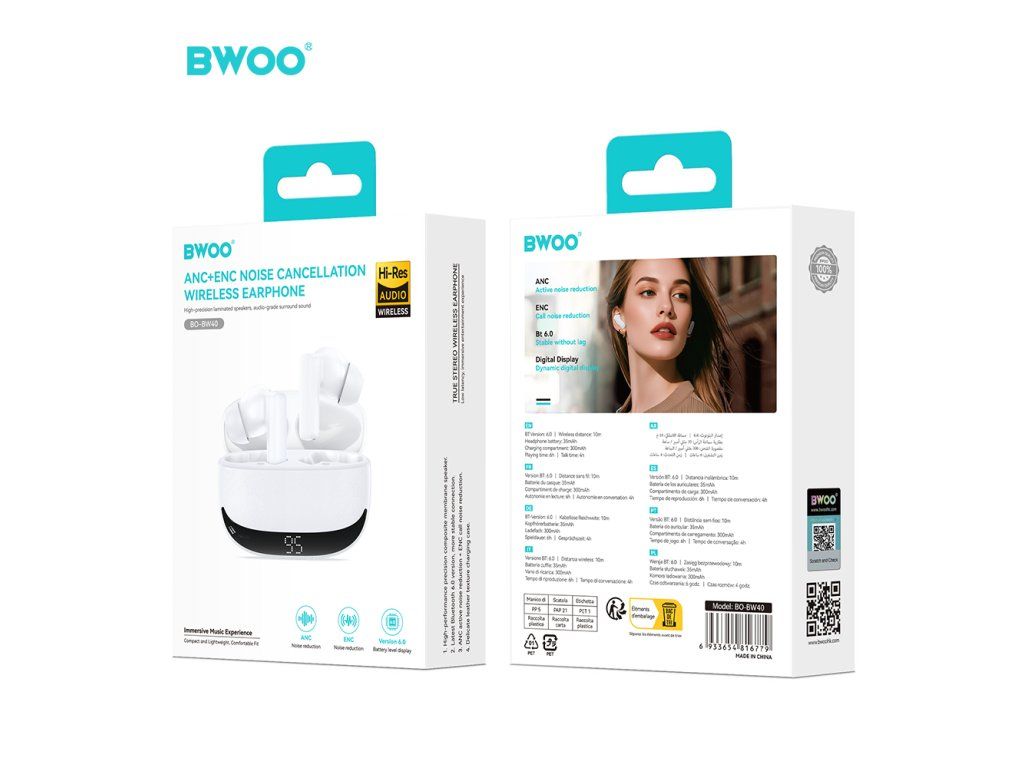 Bluetooth sluchátka BWOO BW40 TWS ANC s LCD displejem bílá