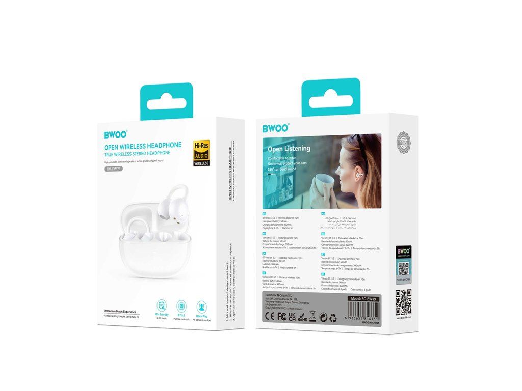 Bezdrátová sluchátka BWOO BW39 s **Open-Ear klipovým designem** jsou ideální pro běžce. Nabízejí stabilitu, odolnost IPX5 a bezpečný poslech s vnímáním okolí.