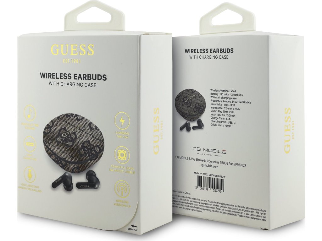Bezdrátová Sluchátka Guess PU 4G Script Logo ENC TWS Objevte svět neomezené svobody a špičkového zvuku s bezdrátovými sluchátky Guess. Tato moderní sluchátka kombinují stylový design s pokročilou technologií, což je činí ideálními pro každodenní používání, ať už při sportu, cestování nebo práci. Bezdrátová sluchátka Guess jsou perfektní volbou pro ty, kteří hledají kombinaci stylu, komfortu a vynikajícího zvuku. Vyberte si sluchátka Guess a užijte si hudbu i hovory bez kompromisů, kdekoliv a kdykoliv. Klíčové vlastnosti: • Prémiová kvalita zvuku: Vychutnejte si bohatý a vyvážený zvuk s hlubokými basy a čistými výškami. Díky pokročilým měničům vám sluchátka Guess poskytnou dokonalý poslechový zážitek. • Ergonomický design: Sluchátka jsou navržena tak, aby pohodlně seděla v uších po celý den. Lehká konstrukce a ergonomický tvar zajišťují komfort i při dlouhodobém nošení. • Bezdrátová svoboda: Užijte si svobodu pohybu bez kabelů. Sluchátka využívají technologii Bluetooth 5.4, která zajišťuje stabilní a rychlé připojení ke všem vašim zařízením, a to s dosahem až 10 metrů • Dlouhá výdrž baterie: Sluchátka Guess vám spolu s nabíjecím pouzdrem poskytují až 16 hodin přehrávání hudby a až 180 dní v pohotovostním režimu. • Stylové nabíjecí pouzdro: Elegantní nabíjecí pouzdro s logem Guess nejen chrání sluchátka, ale také je udržuje plně nabitá. Pouzdro je kompaktní a snadno se vejde do kapsy nebo tašky. • Integrovaný mikrofon a ovládání: Vestavěný mikrofon umožňuje snadné přijímání hovorů bez nutnosti sundávat sluchátka. Ovládací prvky na sluchátkách umožňují snadné přepínání mezi skladbami, upravování hlasitosti a přijímat hovory. • Technologie ENC: ENC se zaměřuje na vyčištění vašeho hlasu během hovoru tím, že odstraňuje hluky ve vašem okolí. Technické specifikace: • Typ připojení: Bluetooth 5.4 • Dosah: Až 10 metrů • Kapacita baterie (sluchátko): 30mAh • Kapacita baterie (nabíjecí pouzdro): 250mAh • Celková doba přehráváni: až 16 hodin • Doba nabíjení: cca 1,5 hodiny • Nabíjecí port: USB-C