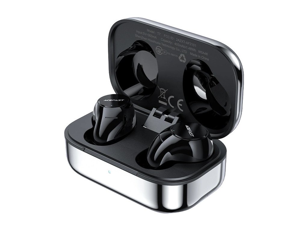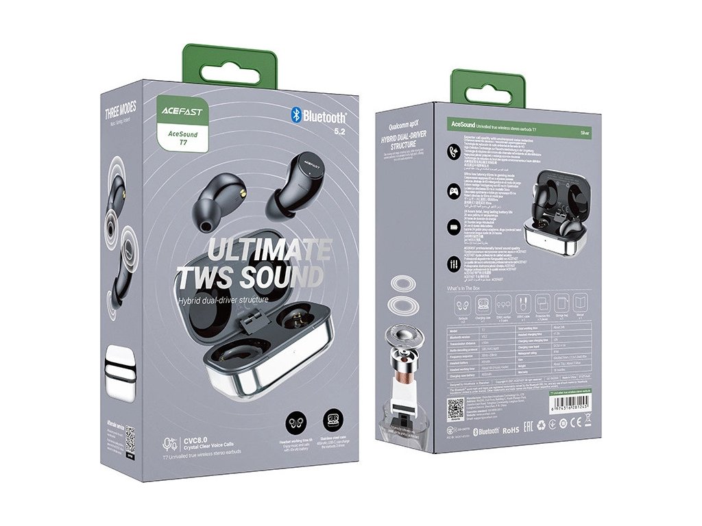 Bezdrátová herní sluchátka Acefast TWS do uší s technologií Bluetooth 5.2, technologií blokování hluku CVC 8.0, protokoly přenosu zvuku aptX, SBC a AAC, zpožděním až 65 ms a třídou voděodolnosti IPX4 - stříbrná (T7)