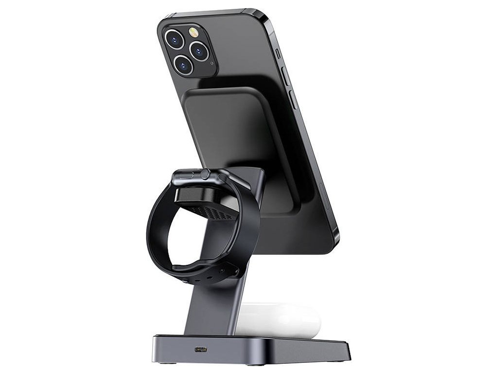 Indukční nabíječka Baseus Stand 3 v 1 15W MagSafe Indukční nabíječka Baseus umožňuje díky své chytré konstrukci nabíjet až tři zařízení současně.