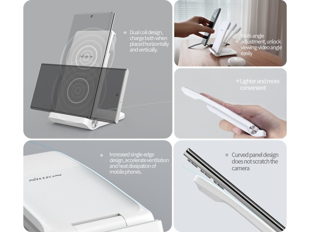 Nillkin Power Trio bezdrátová nabíječka pro Váš telefon, bezdrátová sluchátka a chytré hodinky Huawei Watch. Už Vás nebaví změť kabelů na stole, hledání který kabel je pro které zařízení? S tím je konec. Nillkin Přináší nabíječku pro telefon, chytré hodinky a bezdrátová sluchátka. Jen jeden kabel a máte na stole pořádek, který Vám budou všichni závidět. Vše plně ovladatelné jen jednou rukou Pro telefon je zde jednoduchý stojánek, kam telefon jednou rukou postavíte. Nabíjení započne automaticky. Pro chytré hodinky je zde magnetický stojánek, který se právě díky magnetu postará o bezpečné a přesné uchycení hodinek. A v neposlední řadě bezdrátové nabíjení TWS sluchátek na základně za telefonem. Jen jeden kabel a telefon s hodinkami máte stále na očích. Stojánek je navržen tak, abyste měli svůj telefon i hodinky neustále na očích. To oceníte jak na pracovním stole, tak na nočním stolku nebo na poličce doma. Už Vám žádné upozornění ani hovor nemá šanci uniknout. Skladný, vhodný i na cesty Stojánek je možné složit a vzít ho s sebou kamkoliv. Na dovolenou, na jednání nebo ho snadně přenášet mezi pracovním stolem doma a v zaměstnání. Základnu pro nabíjení hodinek můžete navíc odpojit a použít ji samostatně jen pro hodinky. Je vybavena vstupem USB-C Vlastnosti - nabíjecí stojánek pro telefon, chytré hodinky Huawei Watch a bezdrátová sluchátka - dvojice nabíjecích cívek pro telefon - telefon lze nabíjet v horizontální poloze, ale i ve vertikální - skladný a snadno přenositelný - nabíjecí výkon 15W pro telefon - nabíjecí výkon 5W pro chytré hodinky - nabíjecí výkon 3W pro sluchátka - odnímatelná základna pro nabíjení hodinek s USB-C vstupem - ochrana proti položení cizích těles Kompatibilita: Huawei Watch 3/3 Pro/3 Pro New Huawei Watch GT 2/2 Pro ECG/3/3 Pro/Runner/Buds/Cyber