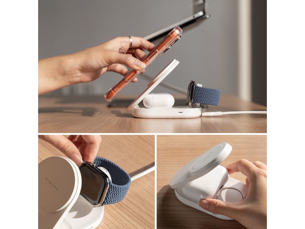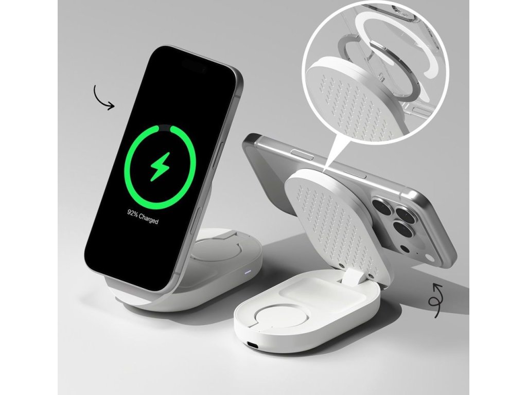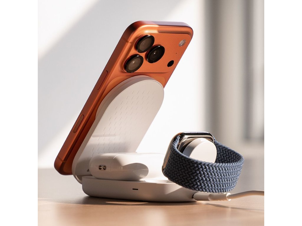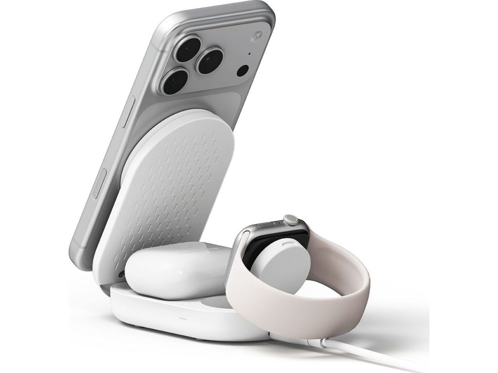 Díky skládacímu designu nabízí nabíječka dva praktické režimy: režim stojanu, ideální pro práci nebo sledování obsahu, a režim podložky, ideální na cesty. Hlavní panel MagSafe s výkonem 25 W poskytuje ultrarychlé nabíjení iPhonu v orientaci na výšku i na šířku, což umožňuje pohodlné používání během nabíjení. Speciální dokovací stanice pro Apple Watch (3 W) a vestavěná indukční podložka (5 W) pro AirPods vytvářejí kompletní nabíjecí centrum.