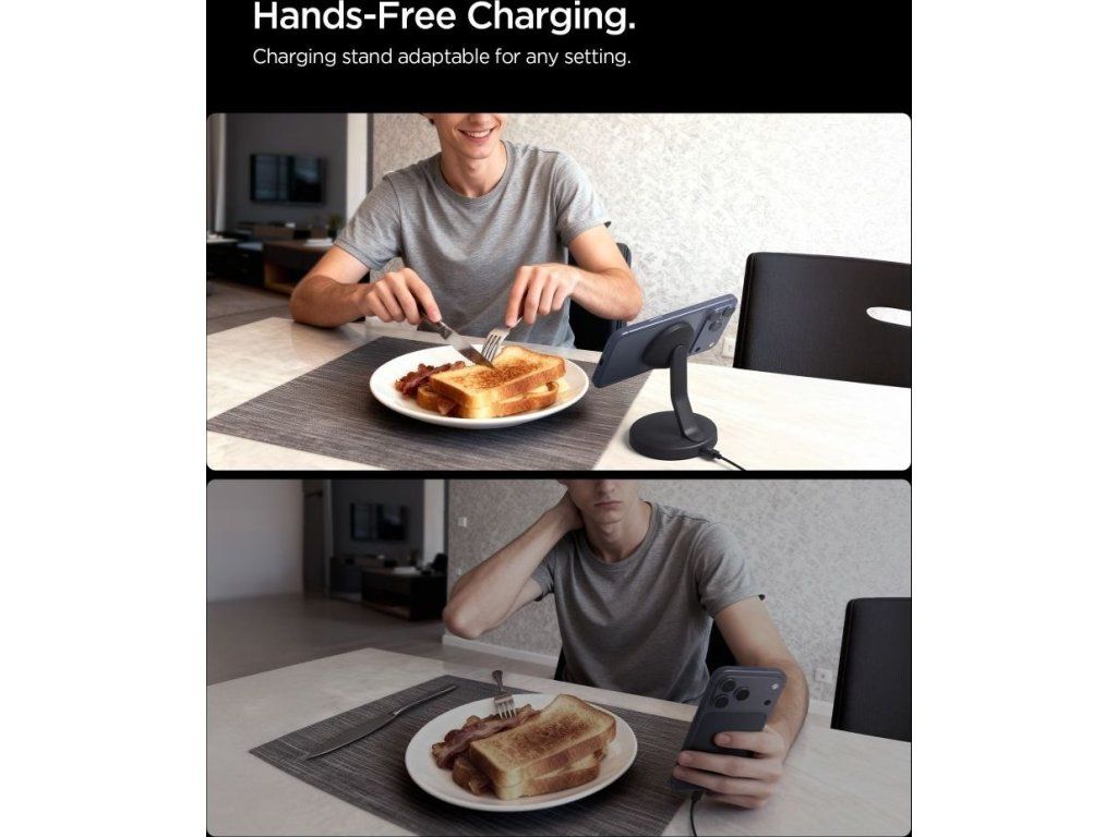 Nabíječka Spigen EF151MS Essential využívá technologii MagSafe, která umožňuje rychlé a přesné uchycení telefonu pomocí magnetického kruhu. Díky tomu se smartphone automaticky srovná do správné polohy pro efektivní bezdrátové nabíjení.
