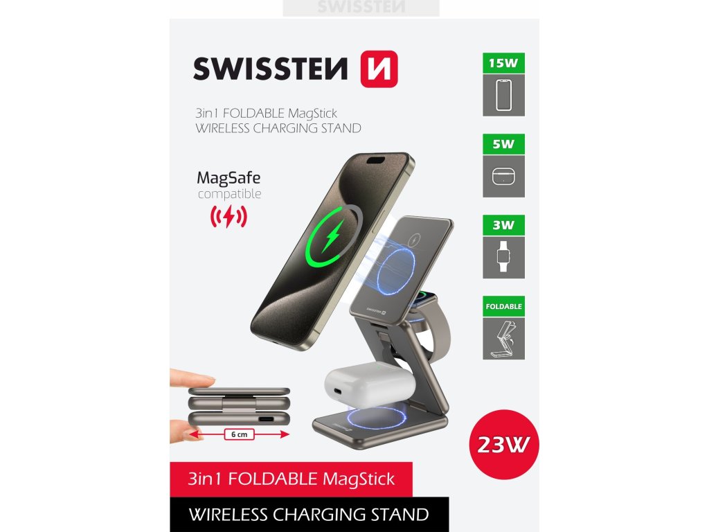Hledáte spolehlivou, velmi dobře skladnou bezdrátovou nabíječku? V tom případě je pro vás Swissten skládací bezdrátová nabíječka 3v1 správnou volbou. S nabíječkou nabijete 3 zařízení najednou, a to celkovým výkonem 23 Wattů. Baleno v blistru SWISSTEN.