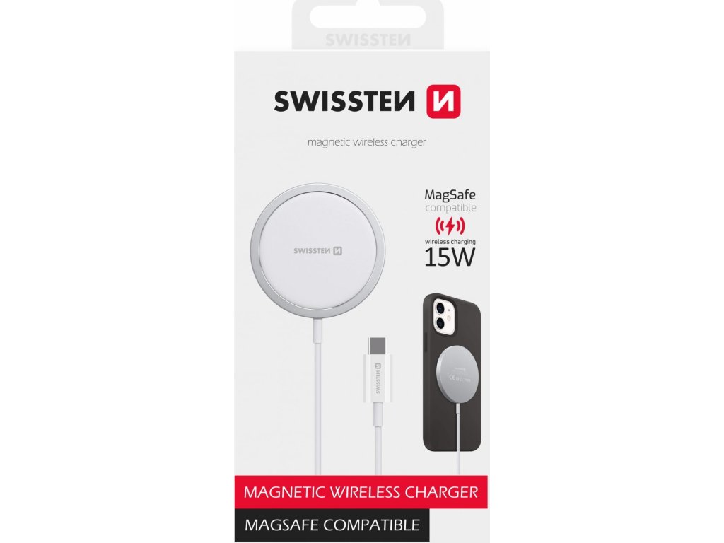 Bezdrátová nabíječka SWISSTEN MagStick pro dobíjení zejména Iphone 12 a novějších (kompatibilní s MagSafe). Výkon 15W. Baleno v blistru SWISSTEN.