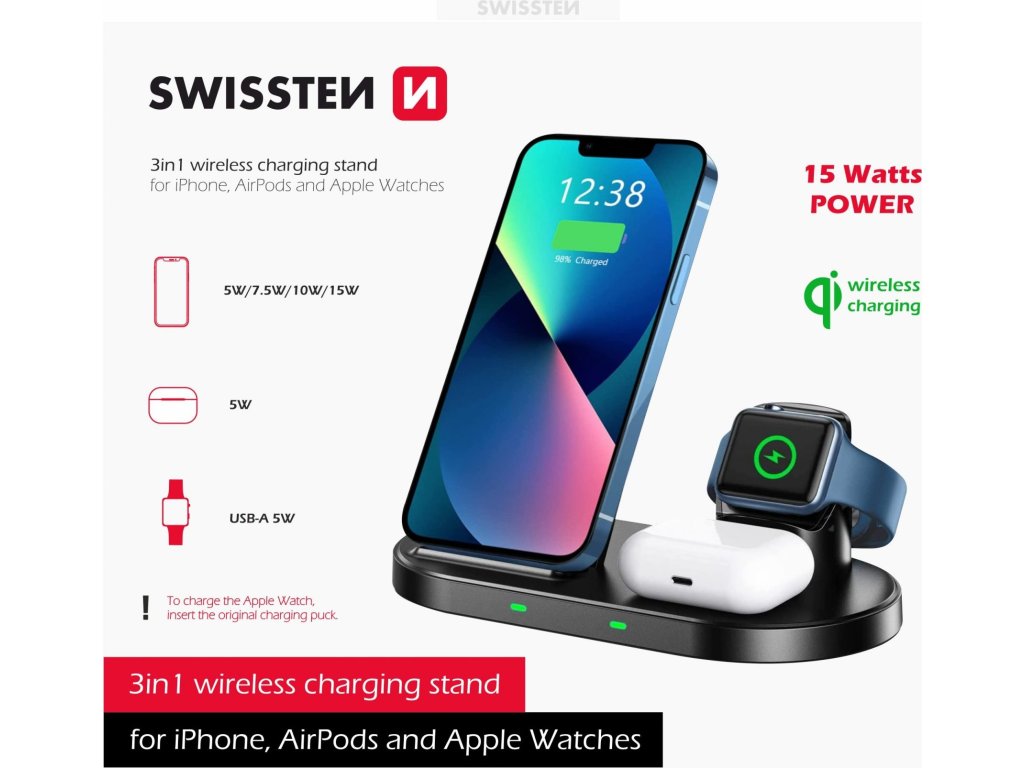 Bezdrátová nabíječka SWISSTEN 3v1 STAND pro nabíjení smartphonu, Applewatch i Airpodu s celkovým výkonem 15W. Baleno v blistru SWISSTEN