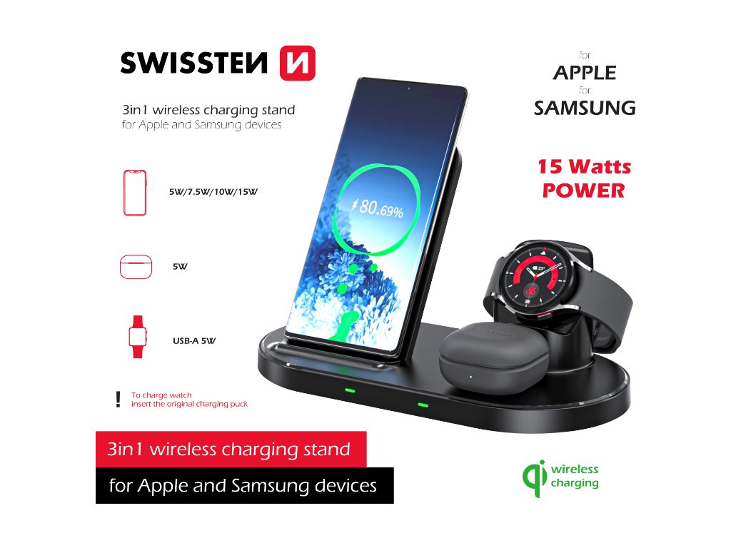 Bezdrátová nabíječka SWISSTEN 3v1 STAND pro nabíjení smartphonu, chytrých hodinek a sluchátek TWS značek Samsung a Apple s celkovým výkonem 15W. Baleno v blistru SWISSTEN
