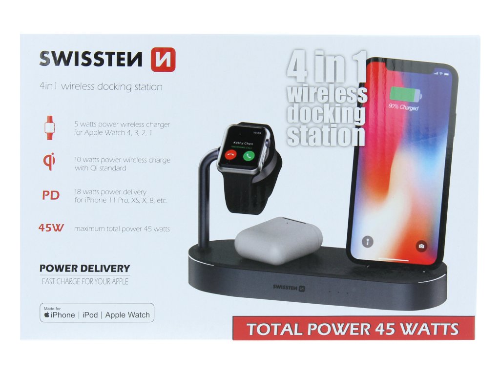 Máte Iphone 8 nebo novější? Chcete využívat bezdrátové nabíjení u Apple Watch, smartphonu, nebo rychlého nabíjení iPhonu Power Delivery? Pak je tato nabiječka 4v1 ideální volbou. Nabiječká má navíc výstup USB 12W. Baleno v blistru SWISSTEN.