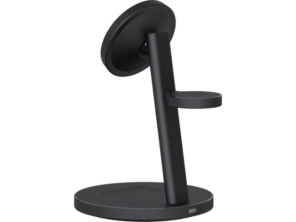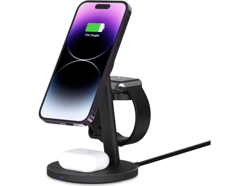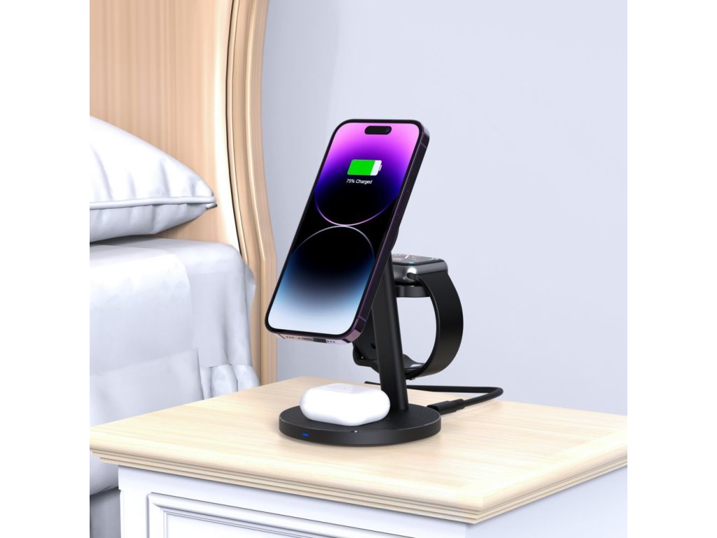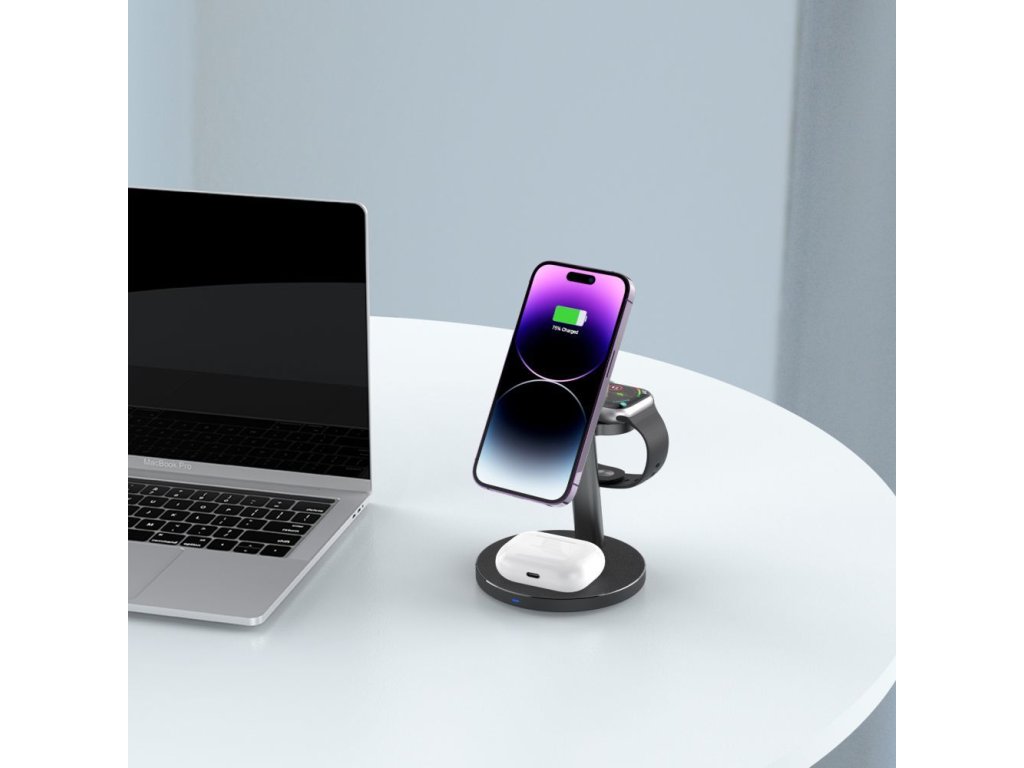 Lehká a stabilní nabíjecí stanice Tech-Protect A9 pro Apple iPhone s technologií MagSafe (iPhone řady 12, 13 a novější), tak příslušenství Airpods a Apple Watch. Stojan je vybaven třemi vyhrazenými nabíjecími místy, které lze používat samostatně i současně. Vestavěný magnet (MagSafe) umožňuje dokonalé spojení bezdrátové nabíječky s telefonem a zajišťuje rychlé a stabilní nabíjení.