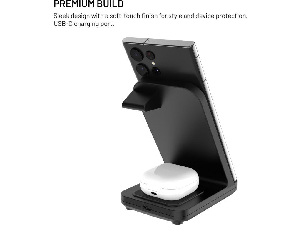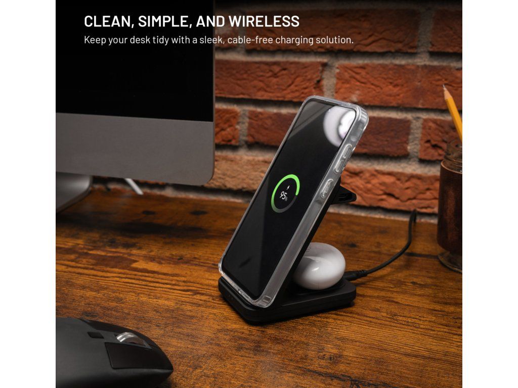 Bezdrátový stojánek FIXED Powerstation Uni nabízí pohodlné nabíjení dvou zařízení zároveň s možností rozšíření o nabíjecí plochu pro chytré hodinky. Hlavní plocha podporuje rychlé nabíjení telefonů výkonem až 15 W a díky kombinované cívce je možné telefon umístit jak v horizontální, tak vertikální pozici. Druhá plocha s výkonem až 5 W je ideální pro bezdrátová sluchátka nebo jiné bezdrátové příslušenství. Stojánek je vybaven USB-C portem pro rozšíření o FIXED nabíjecí adaptér pro chytré hodinky Apple Watch, Garmin nebo Samsung Galaxy Watch. Jemný povrch nabíjecích ploch chrání zařízení před poškrábáním, zatímco protiskluzové podložky zajišťují stojánku stabilitu. Pro maximální výkon doporučujeme použití napájecího adaptéru s výkonem minimálně 25 W ve standardu PD.