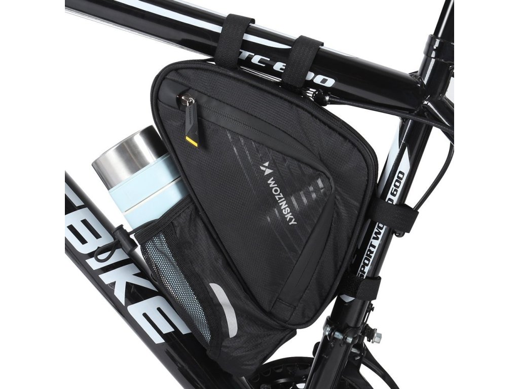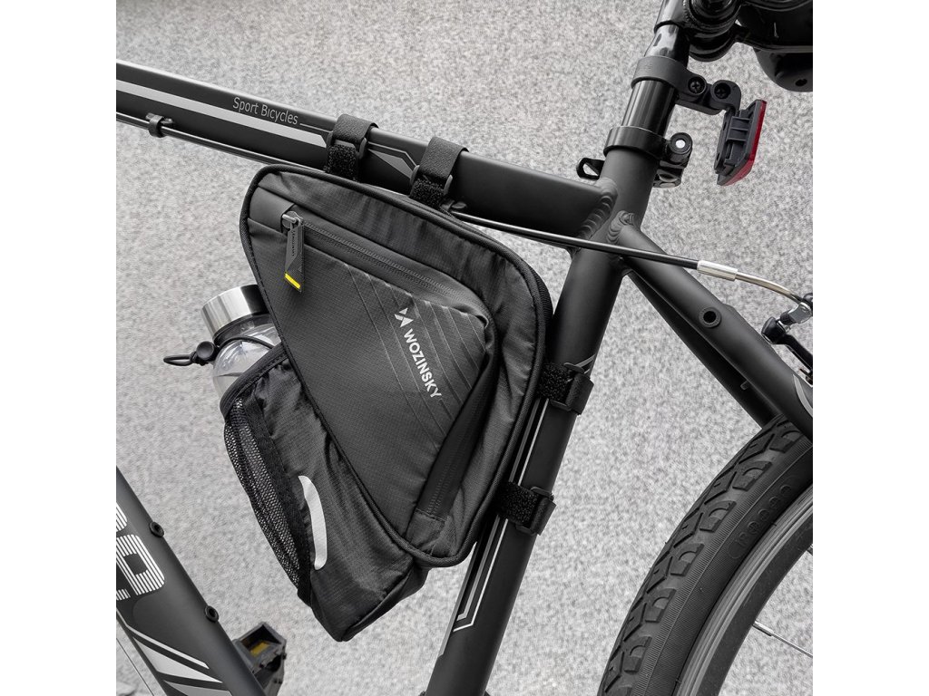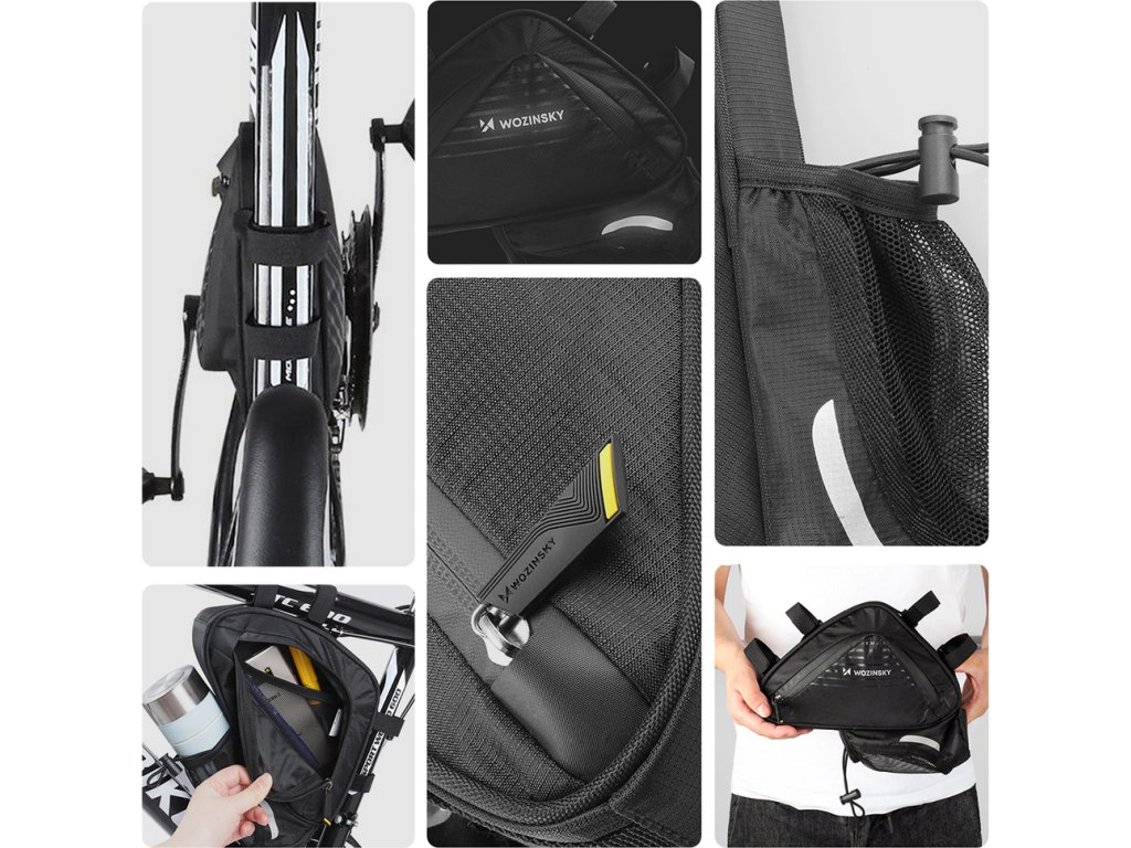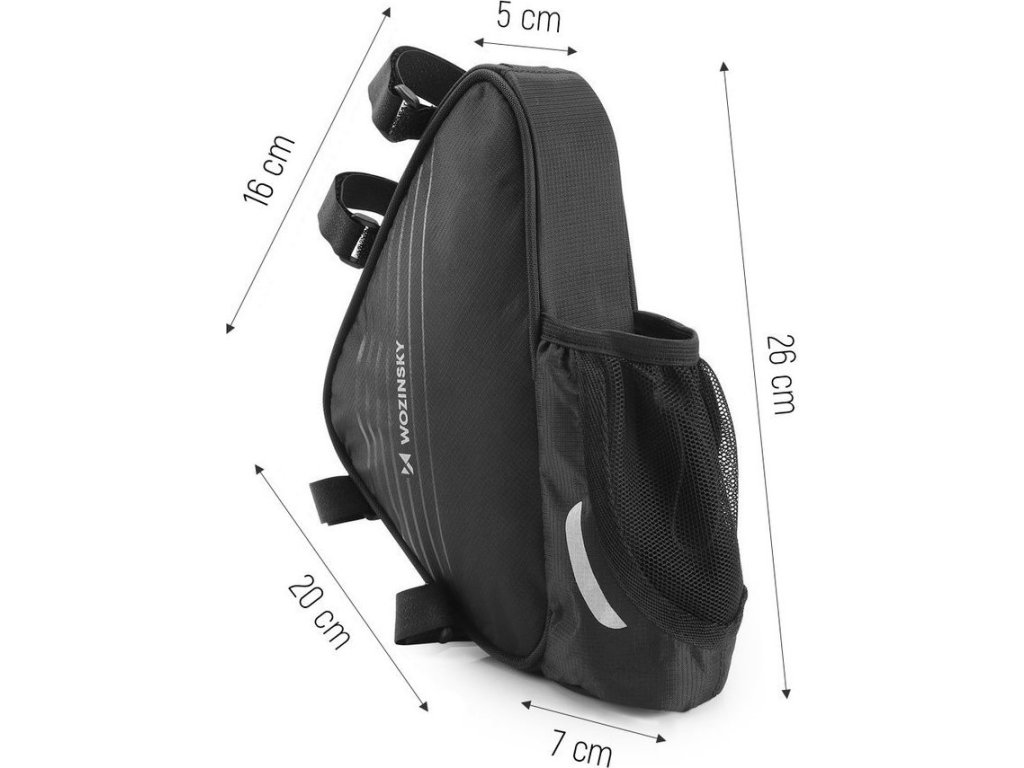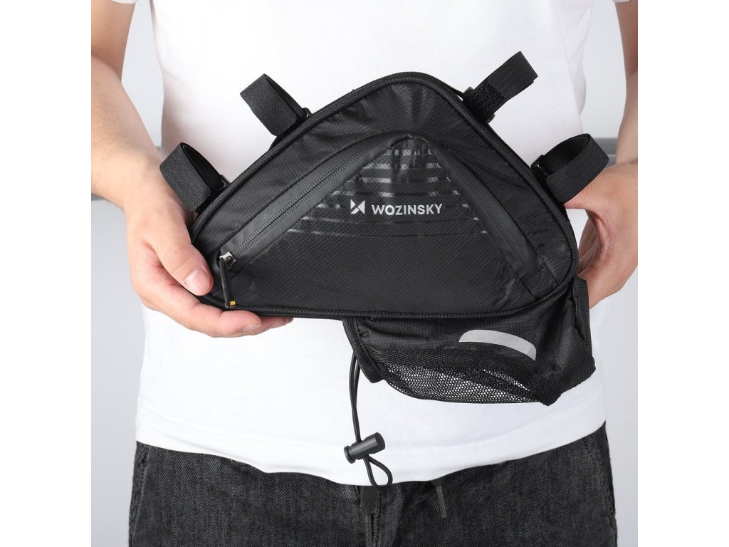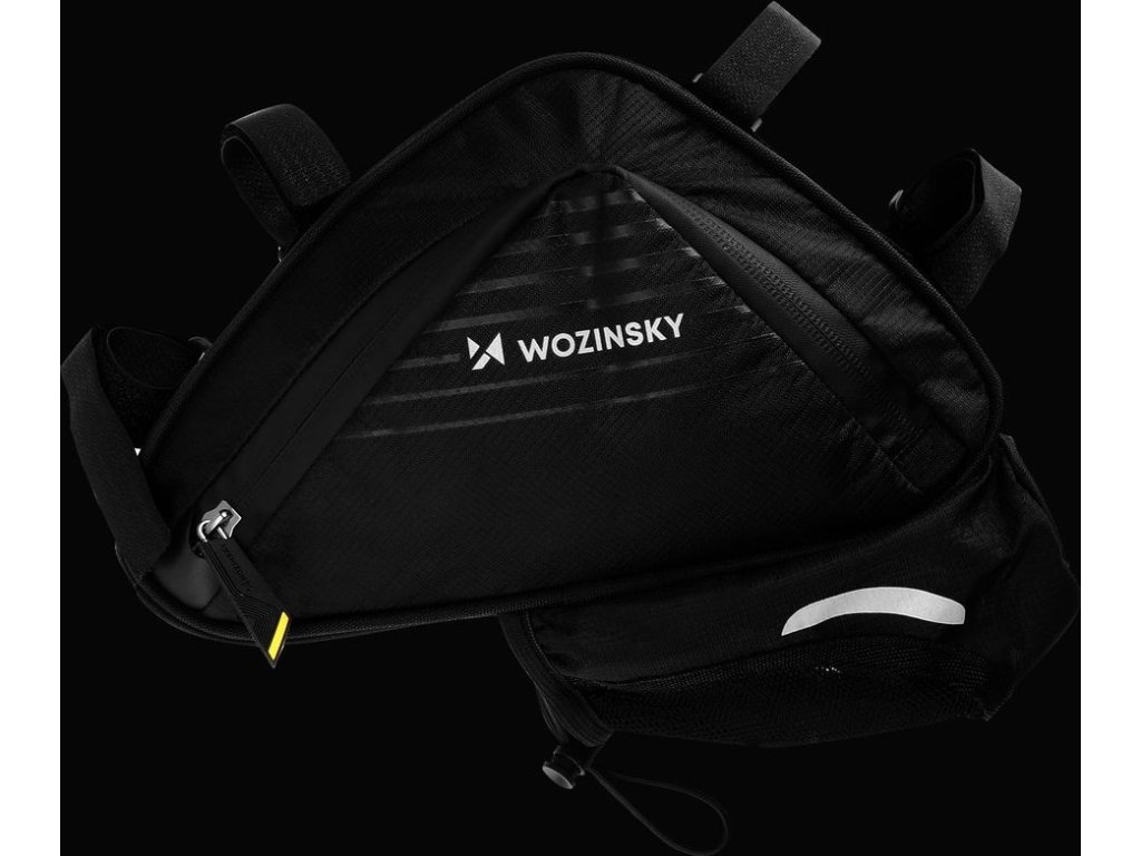 Wozinsky WBB23BK je lehká a kompaktní brašna na rám . Její trojúhelníkový tvar dokonale zapadá do uspořádání rámu . Důležité je, že se tak dobře přizpůsobí tvaru rámu, že při jízdě nepřekáží – zapomeňte na nežádoucí nárazy kolen. Bezpečnost zajišťuje i boční otevírání . Brašnu nemusíte z rámu sundávat, abyste z ní něco vyndali.