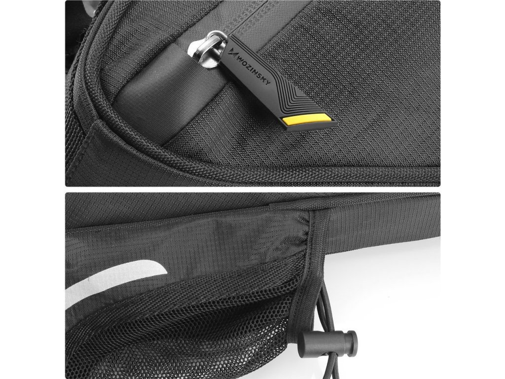 Cyklistické brašny Wozinsky jsou vyrobeny s mimořádnou péčí. Model WBB23BK se pyšní vysoce kvalitními detaily. Obrácený zip chrání vaše věci před navlhnutím ještě lépe. Posuvník má silný, protiskluzový gumový úchop . V kapse na láhev s vodou je gumička , která láhev pevně udrží na místě.