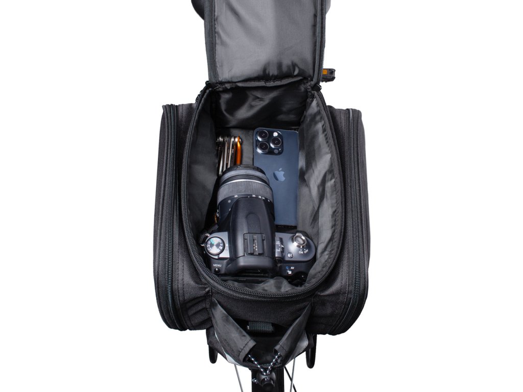 Díky promyšlenému systému upevnění trvá nasazení tašky jen chvilku – a po skončení jízdy si ji můžete rychle sundat a vzít s sebou.