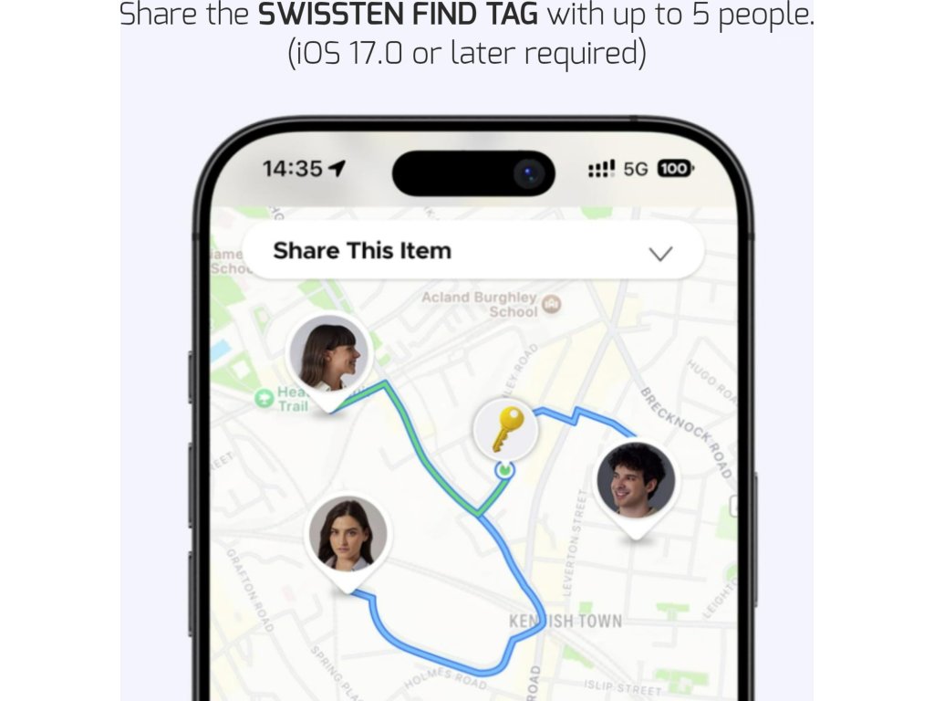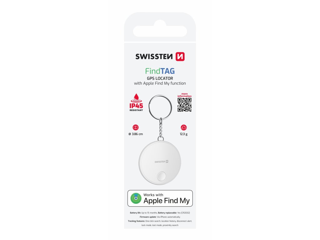 SWISSTEN Find Tag, Chytrý lokátor s funkcí Apple Find My, IP45 odolnost, Výdrž baterie až 15 měsíců, Vestavěný bzučák, Výměnná baterie CR2032, Kompatibilní s klíčenkami a poutky. Baleno v blistru SWISSTEN.
