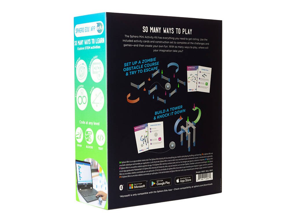 Každá sada obsahuje průhlednou verzi robota Sphero Mini, stavebnici, 15 karet aktivit inspirovaných STEM, kuželky a hrací kostky. S těmito předměty můžete stavět bludiště, navrhovat překážkové dráhy, stavět věže, hrát kroket a mnoho dalšího. Je to dokonalá pomůcka pro rozvoj kreativity a dovednosti řešit problémy.