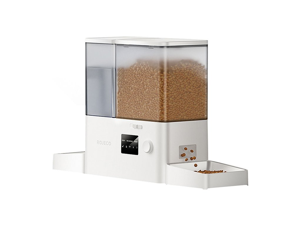 Inteligentní dávkovač krmiva pro domácí mazlíčky Rojeco 3L WiFi verze (bílý) Dávkovač krmiva Rojeco umožňuje přesně spravovat porce jídla vašeho domácího mazlíčka z aplikace nebo vestavěného panelu.