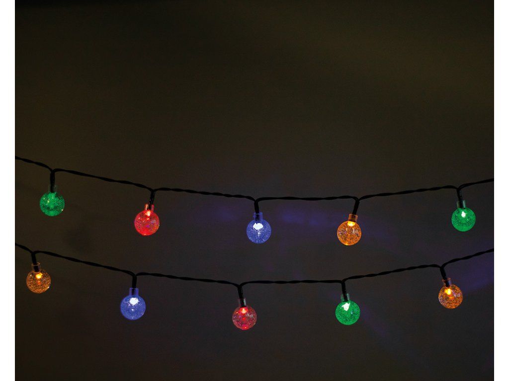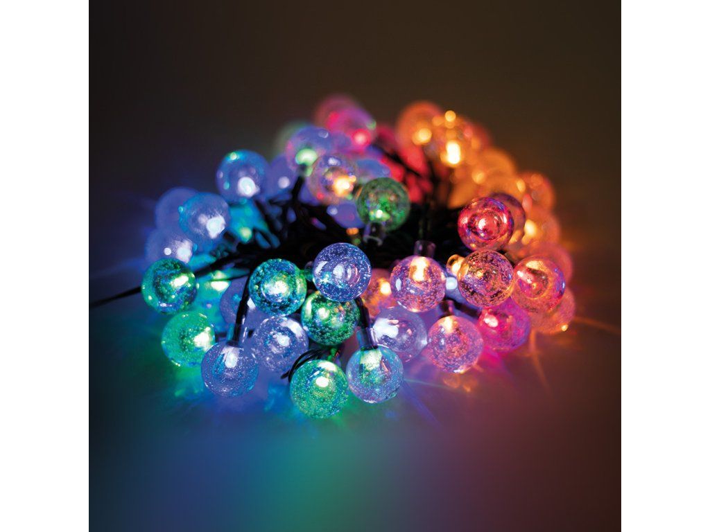 Jemný solární světelný řetěz s barevnými LED diodami s krytem z průhledných kuliček je produkt odolný vůči nárazům a vnějším podmínkám. Kuličky vyzařují elegantní, barevné světlo a vytvářejí jedinečnou atmosféru. Díky krytí IP65 lze řetěz montovat ven. Produkt je ideální pro dekoraci terasy, zahrady nebo verandy. Lze jej také použít jako dekoraci do servisních prostor nebo dekoraci na venkovních akcích. Řetěz o délce 6,5 metru má 30 kuliček rovnoměrně rozmístěných po celé délce. Světelný řetěz má programátor s 8 režimy svícení.