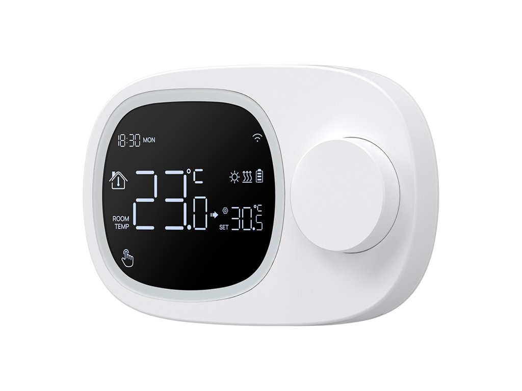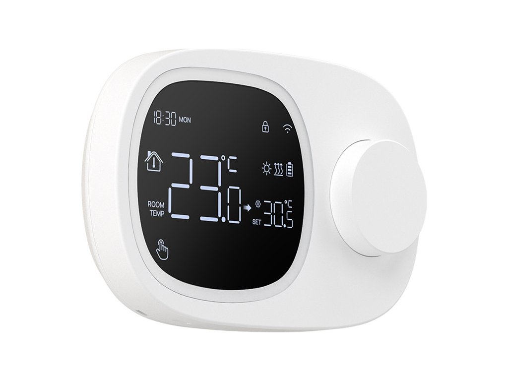 Negativní displej nabízí vysokou čitelnost a jeho jas se automaticky přizpůsobuje provoznímu režimu zařízení. Při běžném provozu je obrazovka dobře viditelná, zatímco v pohotovostním režimu se ztlumí, což pomáhá šetřit energii a neruší spánek v noci. Kromě toho zobrazuje nejen aktuální teplotu, ale také provozní režim, stav připojení WiFi a další užitečné informace. Ovládá se otočným voličem, který funguje bez problémů a umožňuje rychlý přístup k nastavení.
