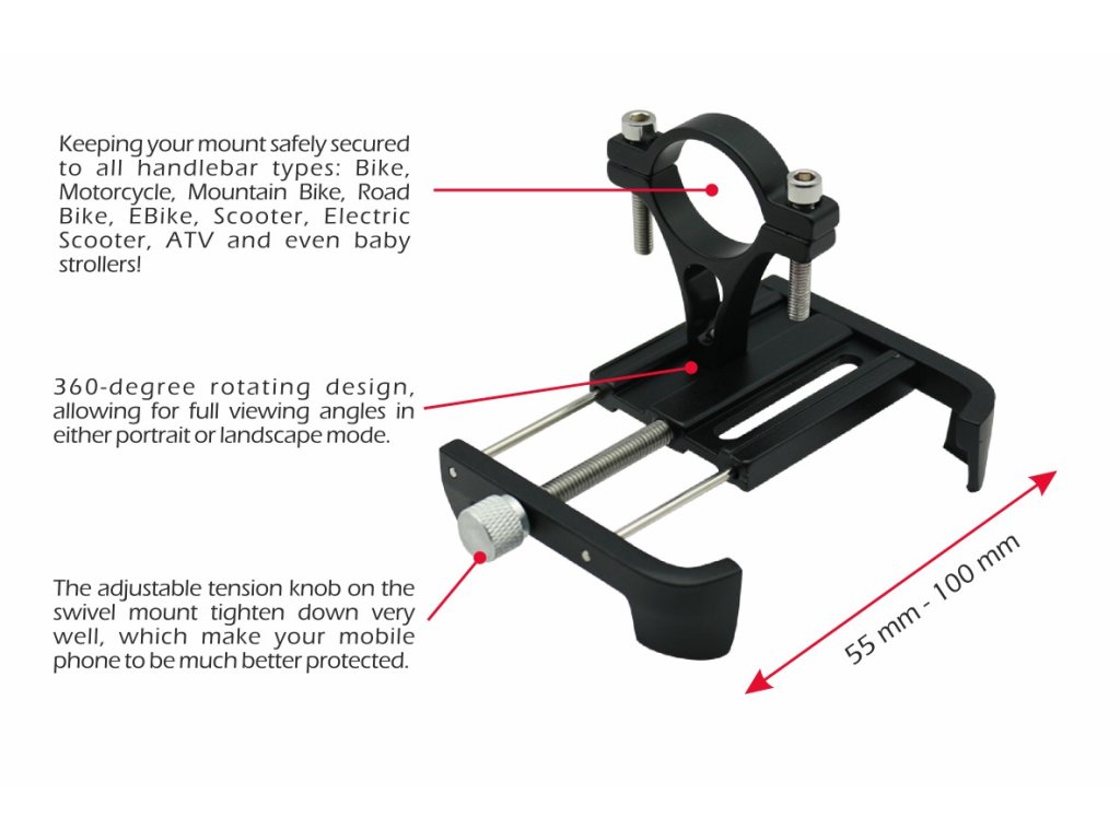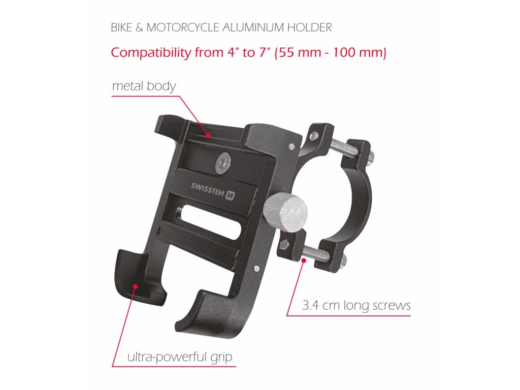 Kovový držák smartphonu 4-7", který se dá využít jak na kolo, tak i na motorku, čtyřkolku, elektrokolo atd. Baleno v blistru SWISSTEN.