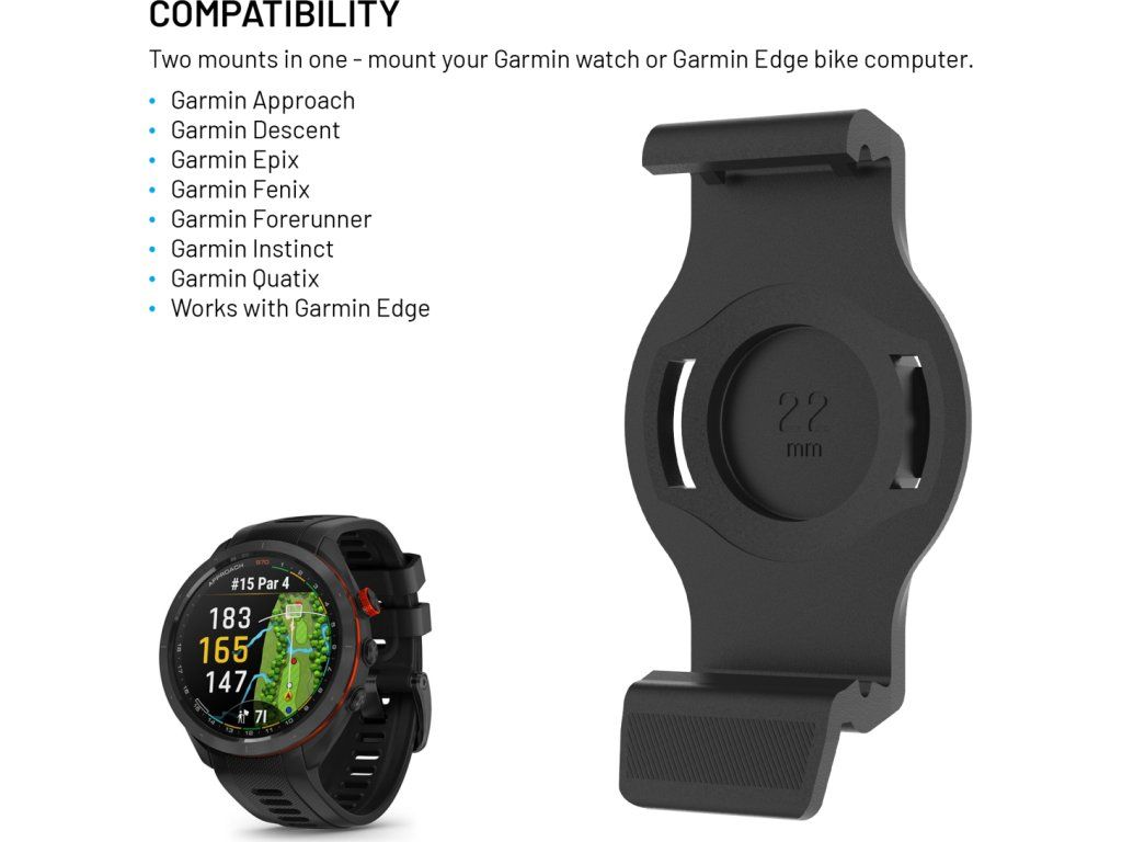Držák je unikátní svou konstrukcí ze dvou částí. První část slouží pro uchycení široké škály chytrých hodinek Garmin o průměru 22 mm, zatímco přibalený nástavec umožní připevnit cyklopočítače řady Garmin Edge. Získáte tak univerzální příslušenství pro všechna vaše zařízení.