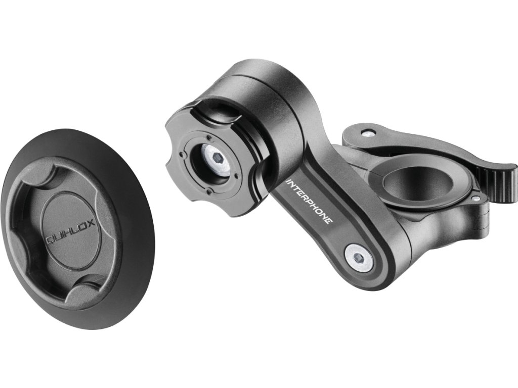 Sada rychloupínacího držáku s úchytem na řídítka a adhezivní základny Interphone QUIKLOX vám umožní mít váš mobilní telefon pohodlně a bezpečně po ruce během jízdy na motocyklu. Jedná se o univerzální držák vhodný pro tubulární řídítka, přizpůsobí se různému průměru. Hlavice držáku je vybavena speciálním systémem QUIKLOX. Ten funguje ve spolupráci s adhezivní základnou SMQUIKLOXPAD, která se instaluje na záda telefonu. Samotnou základnu přilepíte pomocí 3M pásky k zádům vašeho telefonu nebo zadního krytu. Instalace základny je snadná a rychlá a díky minimální tloušťce nijak nevadí při běžném používání telefonu. Po přiložení k držáku telefonem jednoduše pootočíte a ten se tak zajistí pevně k držáku. Stejně rychle pak telefon po skončení jízdy odepnete. Sklon ramene držáku si můžete upravit podle potřeby.