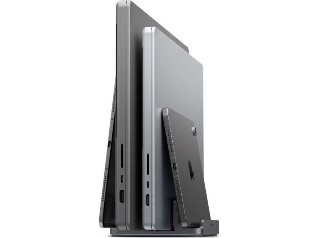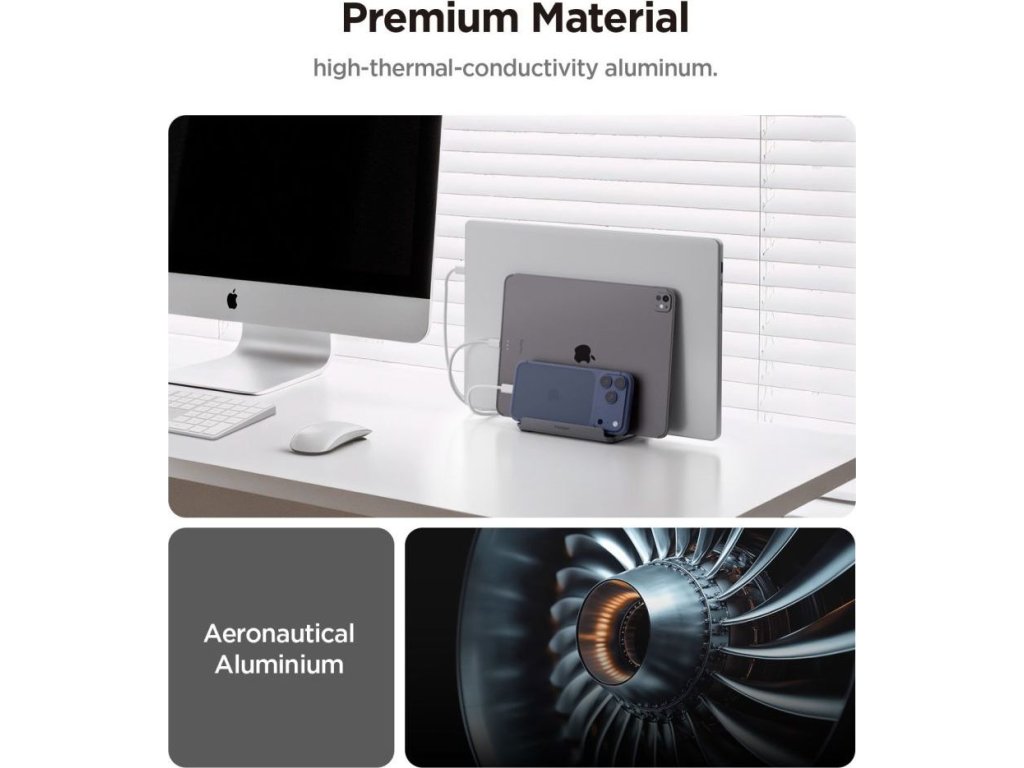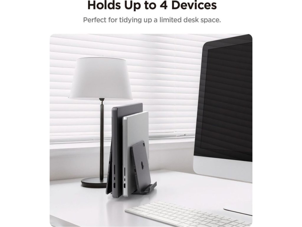 Spigen LD208S4 je kompaktní organizér na stůl, který pojme až čtyři zařízení současně. Notebooky, tablety, chytré telefony a Bluetooth klávesnice – vše najde své místo v elegantním vertikálním designu, který uvolní místo na vašem stole.
