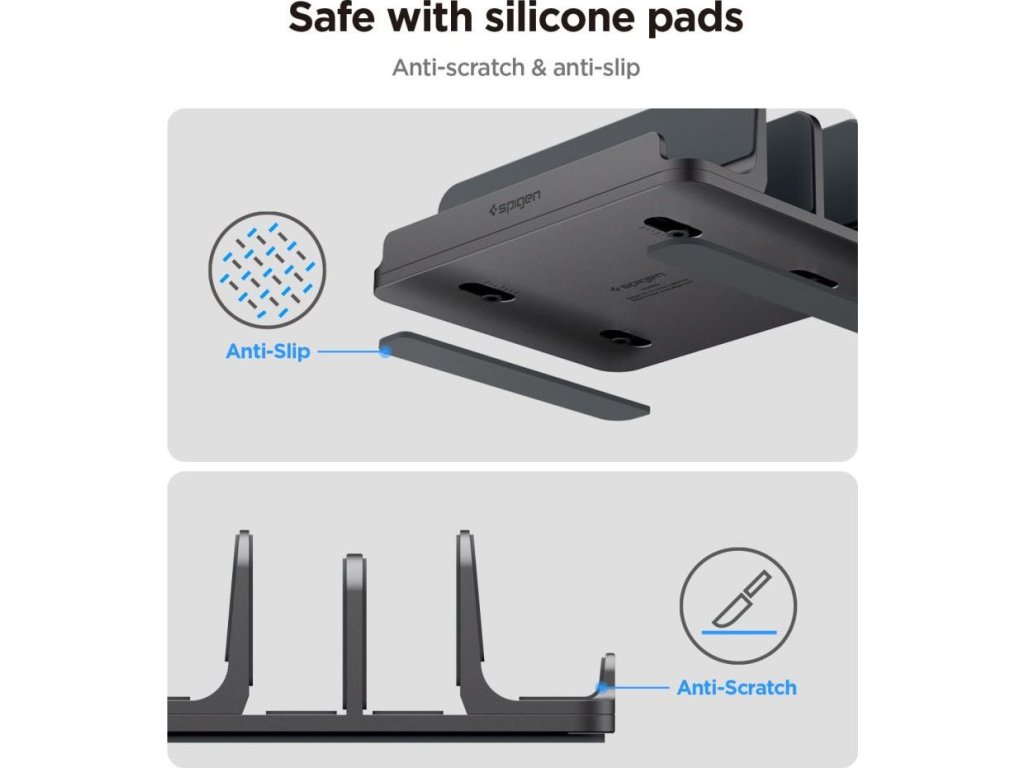 Silikonové vložky uvnitř drážek a protiskluzové podložky na základně poskytují komplexní ochranu. Vaše zařízení jsou chráněna před poškrábáním a celý stojan zůstává stabilní a nebude se posouvat po desce stolu. Toto je perfektní řešení pro ty, kteří si cení minimalistického designu, úhledného stolu a špičkové funkčnosti.