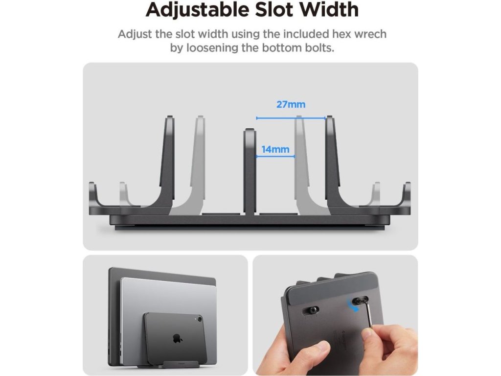 Každý slot ve stojanu je plně nastavitelný. Šířku můžete nastavit od 14 do 27 milimetrů, což zajišťuje perfektní uchycení pro zařízení různých tlouštěk. Ať už pracujete s tenkým ultrabookem nebo silnějším herním notebookem, vaše vybavení bude bezpečně umístěno na určeném místě.