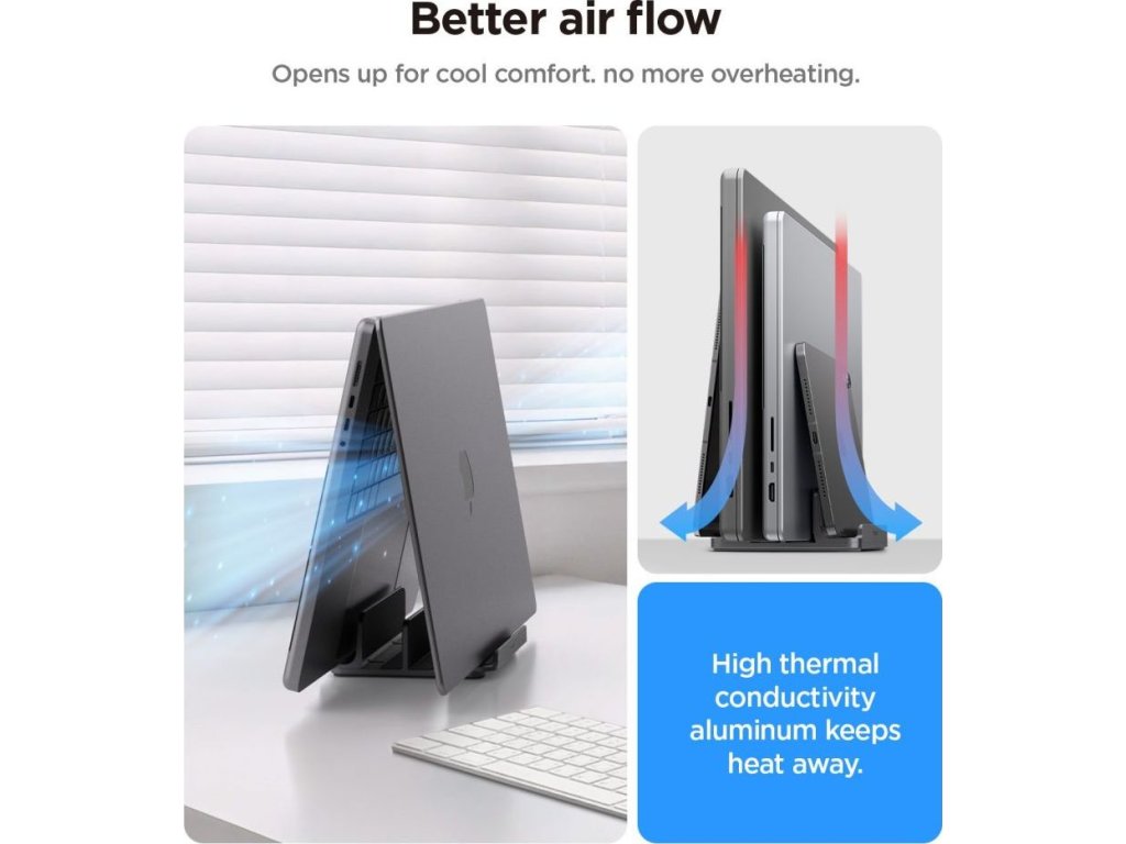Kryt vyrobený z hliníku s vysokou tepelnou vodivostí nejen zaručuje odolnost a stabilitu celé konstrukce, ale také podporuje přirozené větrání zařízení. Teplo je efektivně odváděno, což oceníte zejména při práci s notebookem v zavřeném režimu – nemusíte se obávat přehřátí ani při delší práci.
