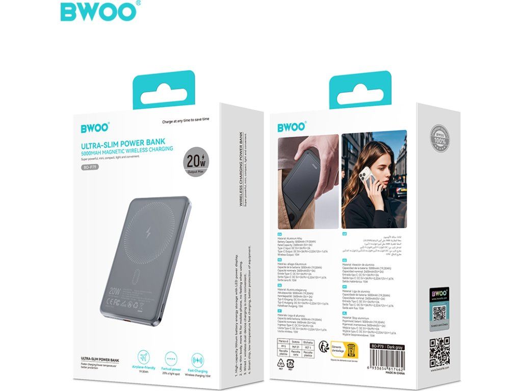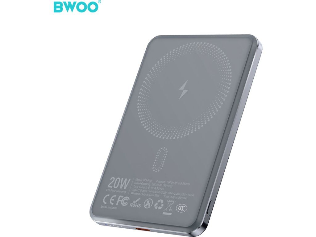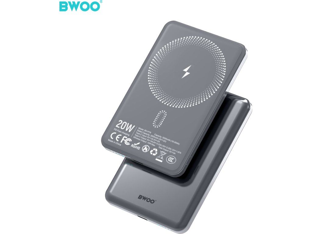 BWOO Ultra Slim Power Bank 20W 5000mAh s magnetickým nabíjením P79 Šedá