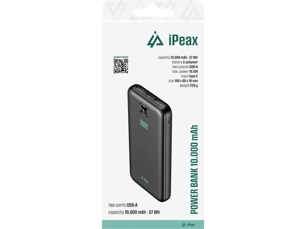 Kompaktní power banka iPEAX s kapacitou 10 000 mAh, dvěma USB-A výstupy a LED indikací stavu nabití. Ideální pro každodenní použití. Typ baterie: Li-polymer. Součástí balení je USB-A / USB-C kabel. Zabaleno v iPEAX balení.