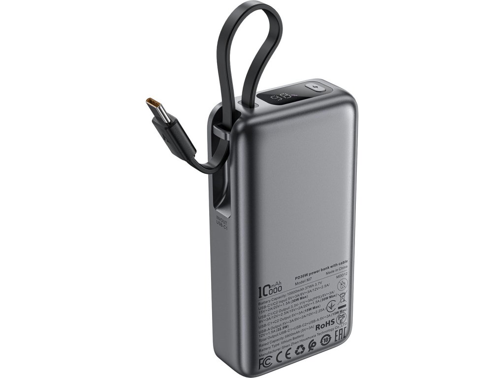 Acefast M7 má integrovaný kabel USB-C, který máte vždy po ruce. To znamená, že se nemusíte starat o zapomenuté kabely, což je ideální pro cesty i každodenní použití.