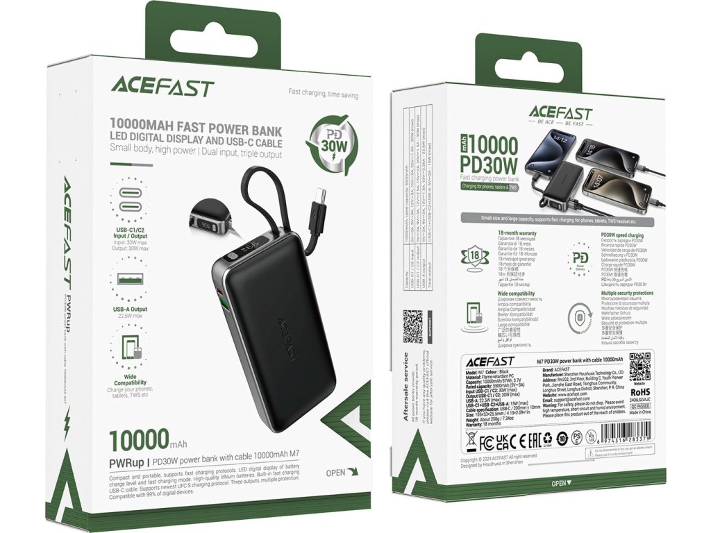 Objevte novou úroveň pohodlí s powerbankou Acefast M7 – spolehlivým společníkem pro každodenní výzvy a cesty. Díky kapacitě 10 000 mAh a rychlému nabíjení s výkonem 30 W si můžete být vždy jisti, že jsou vaše zařízení připravena k akci. Vestavěný kabel USB-C eliminuje nutnost nosit s sebou další kabely a funkce více portů umožňuje nabíjet různá zařízení současně. Moderní LED displej informuje o úrovni nabití a kompaktní a elegantní design dělá z M7 perfektní volbu do každé kapsy nebo tašky. Pokročilé zabezpečení zaručuje bezpečnost vašich zařízení a poskytuje vám klid při používání. Dopřejte si svobodu a jistotu nabíjení s Acefast M7!