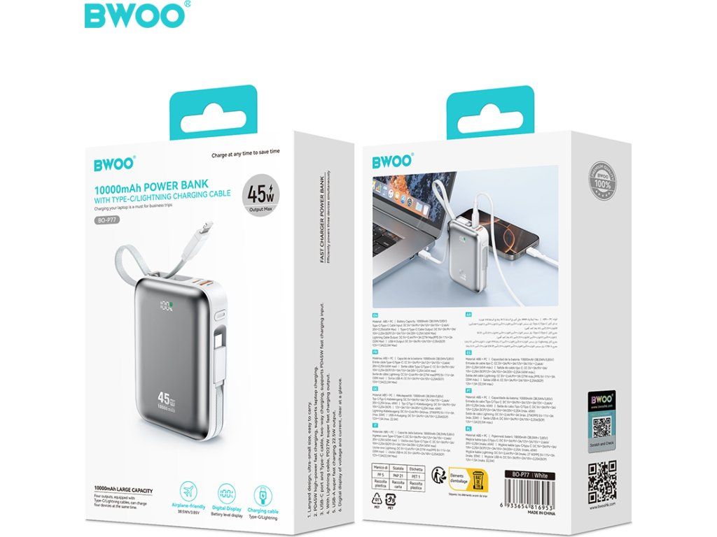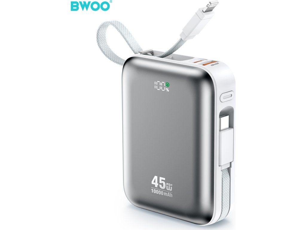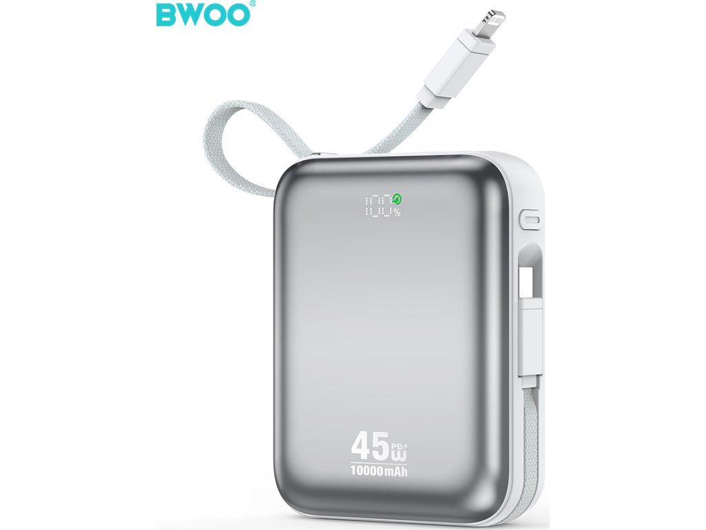 Powerbanka BWOO P77 45W, 10000 mAh s USB-C a Lightning kabelem, šedá