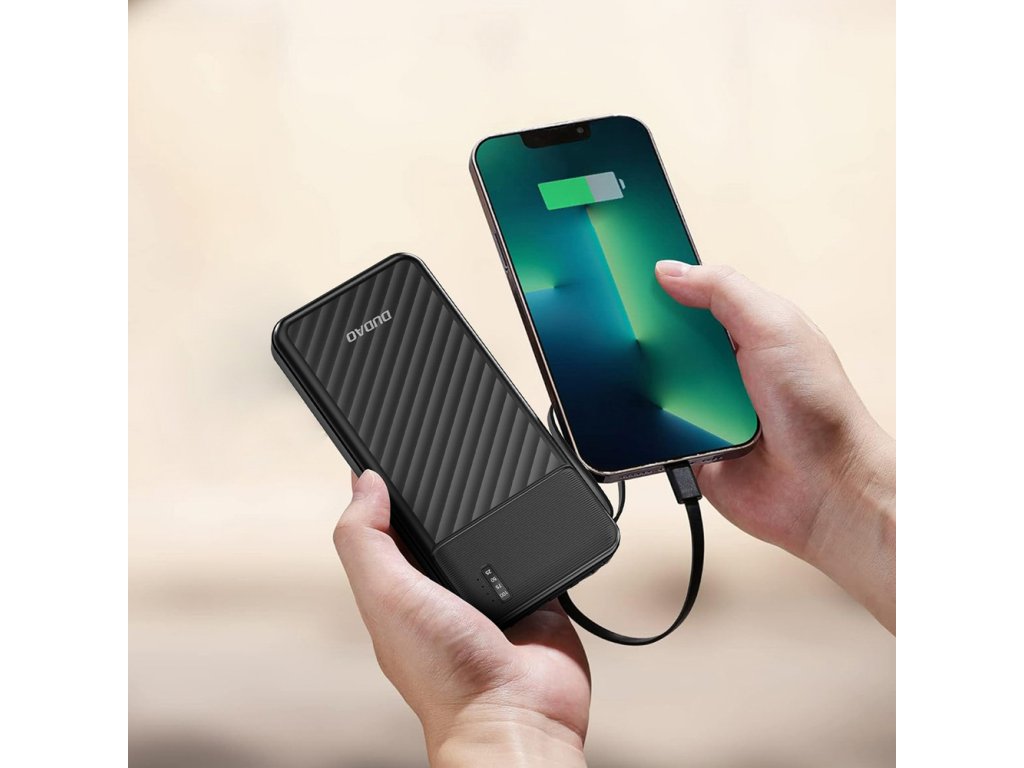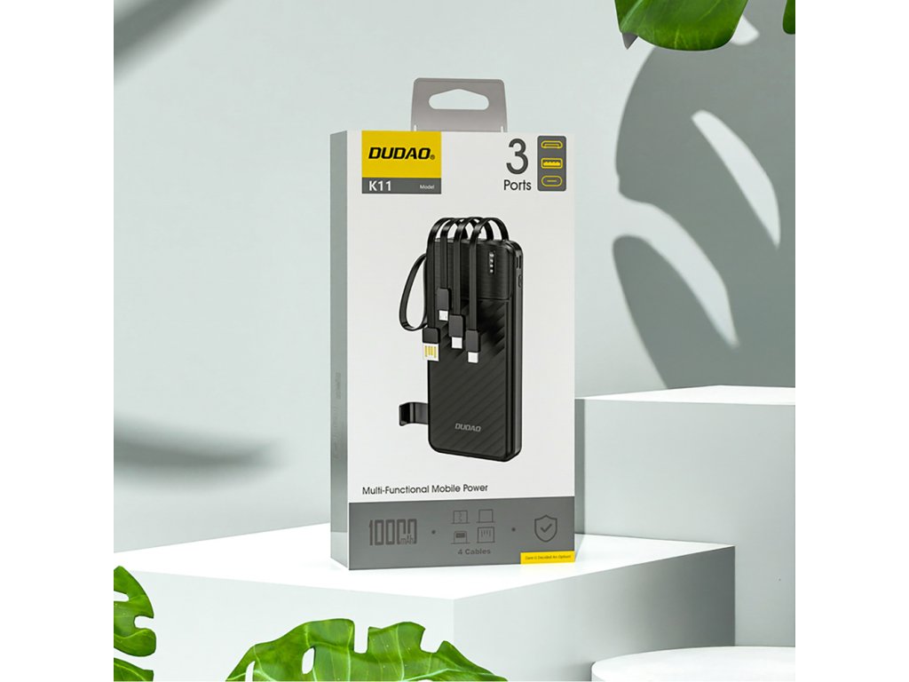 Dudao K11 je kompaktní powerbanka s kapacitou 10 000 mAh, která kombinuje praktičnost a snadné použití. Díky čtyřem vestavěným kabelům (USB-A, USB-C, Lightning a micro USB) můžete nabíjet většinu zařízení bez nutnosti dalších kabelů. Díky malým rozměrům a nízké hmotnosti se snadno vejde do tašky, batohu nebo kapsy. Vestavěný bezpečnostní systém chrání vaše zařízení před přehřátím, přetížením a zkratem a zajišťuje bezpečné a stabilní nabíjení v každé situaci. Je to spolehlivý společník pro každodenní úkoly i cestování.