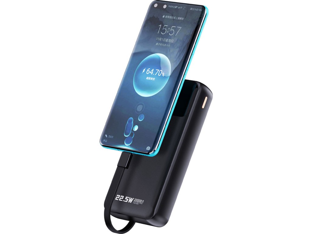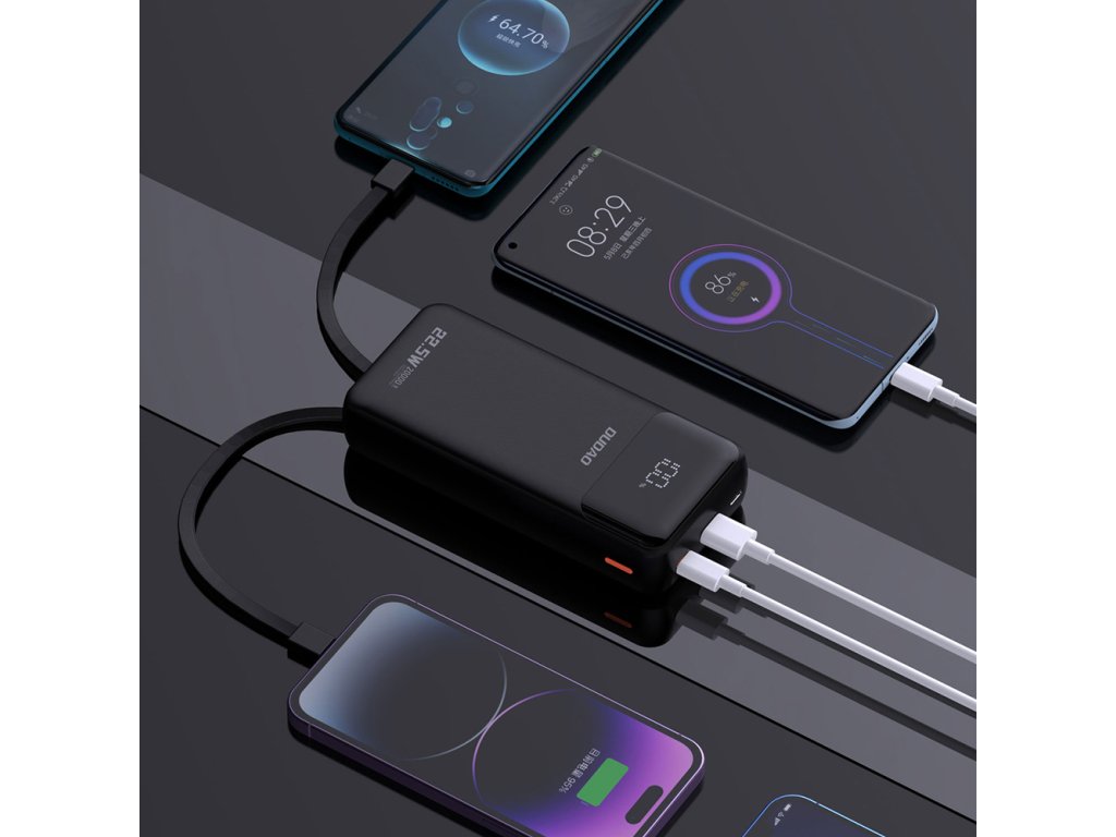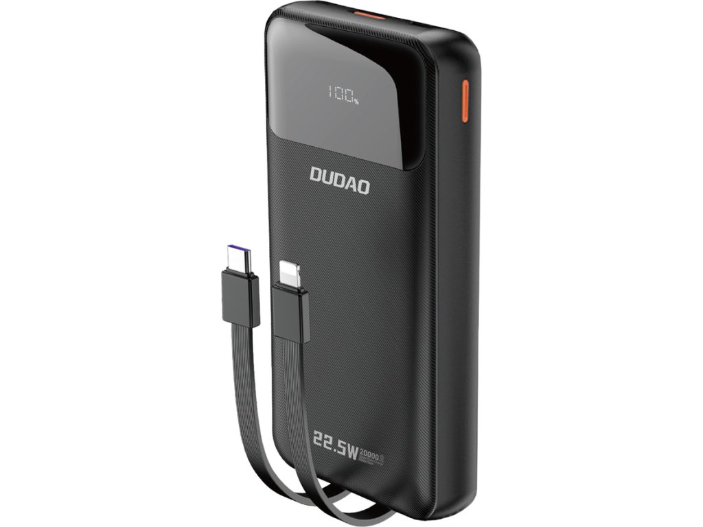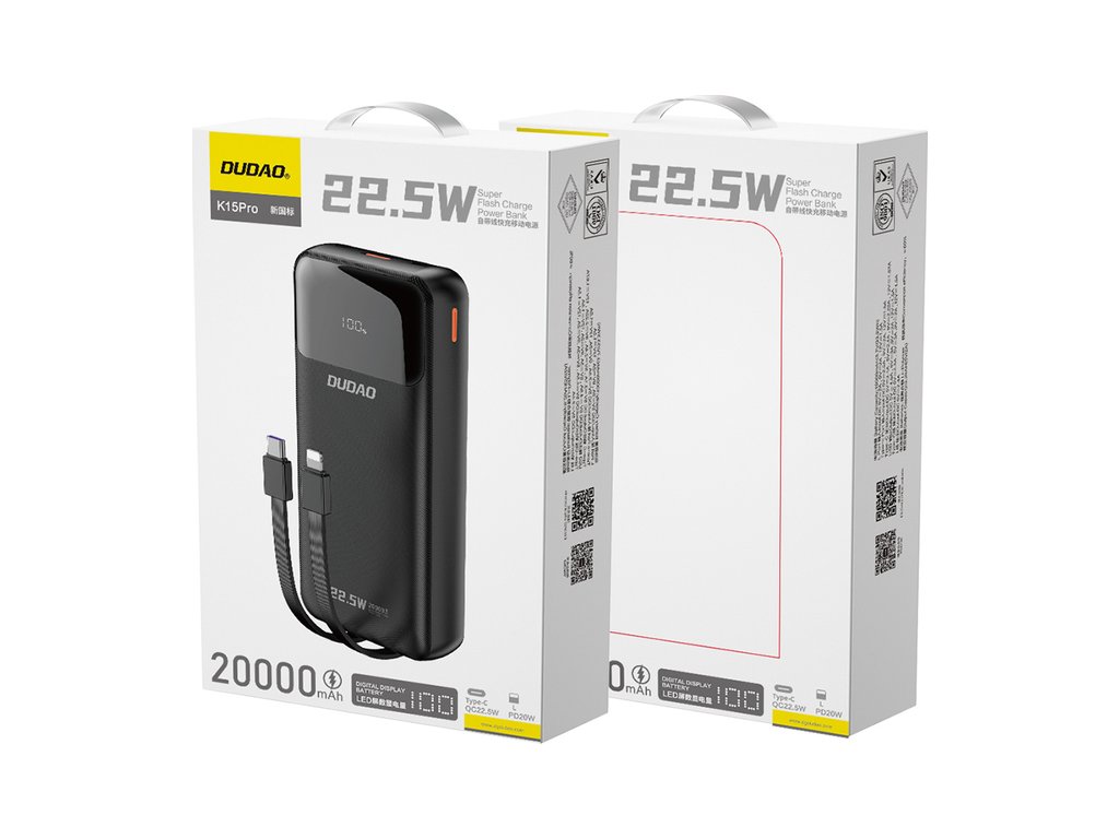Powerbanka Dudao K15Pro s kapacitou 20 000 mAh a výkonem až 22,5 W, s porty USB-C / USB-A a vestavěnými kabely Lightning a USB-C - černá
