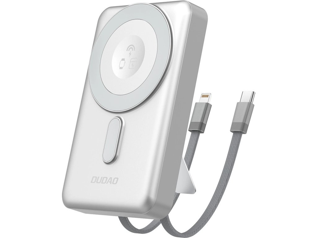 Powerbanka Dudao K29 10000mAh PD 20W MagSafe s kovovým pouzdrem, stojánkem a vestavěnými kabely USB-C/Lightning - stříbrná