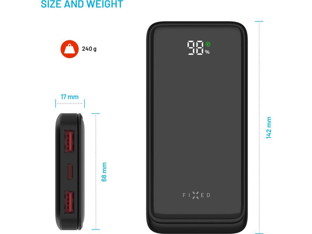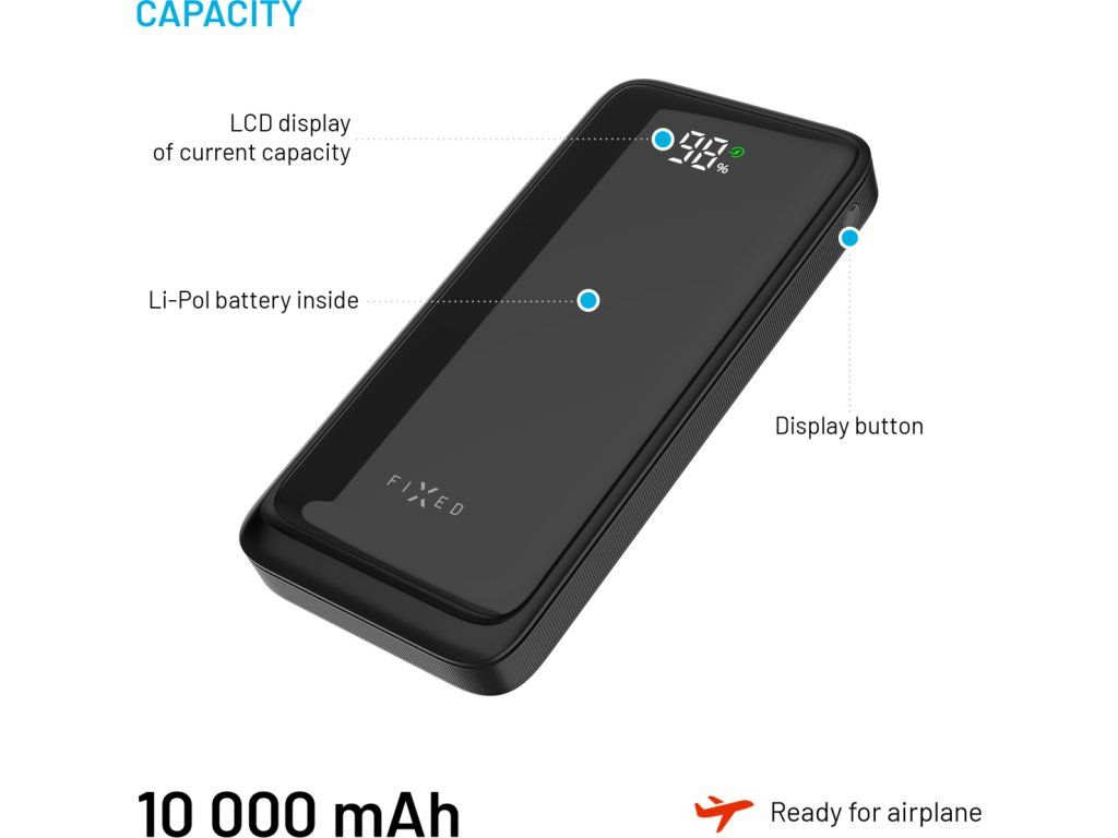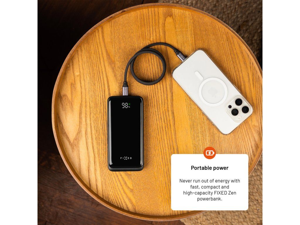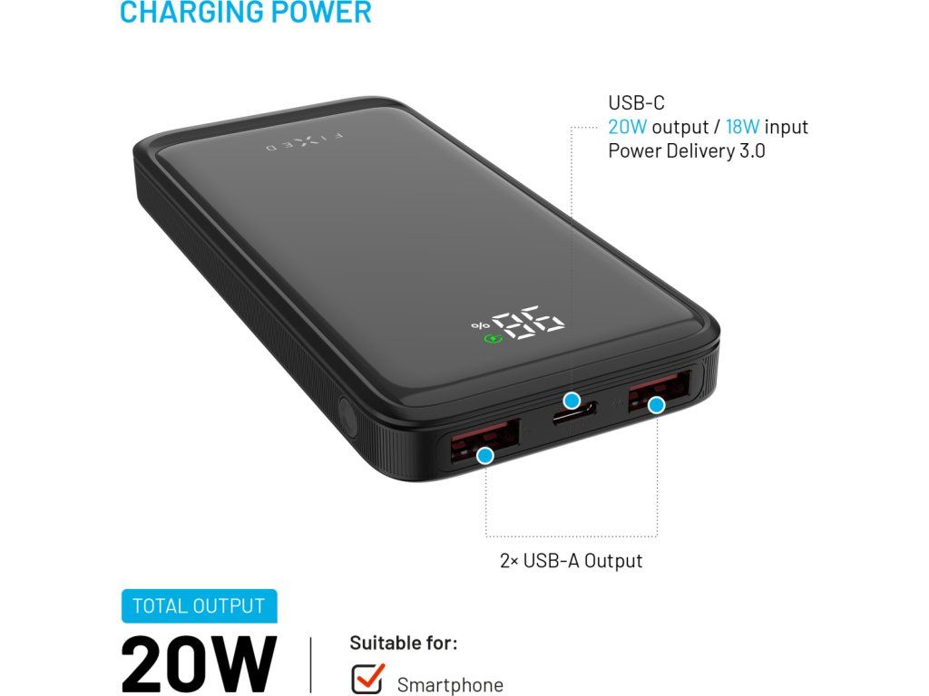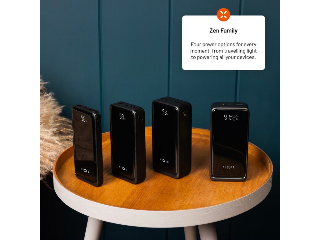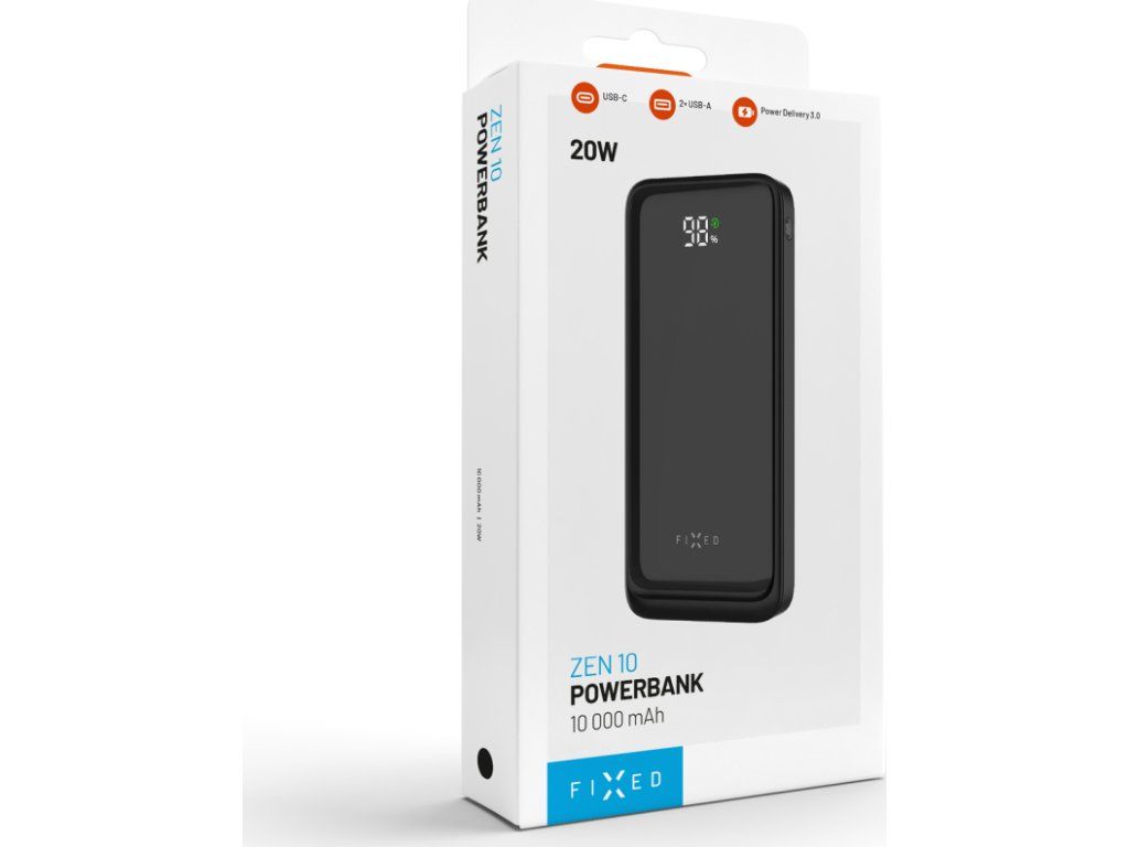 Powerbanka FIXED Zen2 10 představuje spolehlivý záložní zdroj energie, ideální na cesty i pro každodenní použití. S kapacitou 10 000 mAh spolehlivě dobije telefon, sluchátka, hodinky či další zařízení. Díky dvěma USB-A portům a jednomu USB-C portu umožňuje nabíjet až tři zařízení současně. USB-C port navíc podporuje rychlé nabíjení Power Delivery 3.0 s výkonem až 20 W, které se spustí automaticky po připojení zařízení. O aktuálním stavu kapacity informuje přehledný LCD displej s elegantním lesklým povrchem. Samotnou powerbanku lze snadno dobít přes USB-C port výkonem až 18 W, a to i během toho, kdy je powerbankou nabíjeno další zařízení. Díky kompaktním rozměrům a nízké hmotnosti se powerbanka FIXED Zen2 10 snadno vejde do každé kabelky nebo batohu. Je tak ideálním společníkem na cesty, který vašim zařízením dodá energii kdykoli a kdekoli.