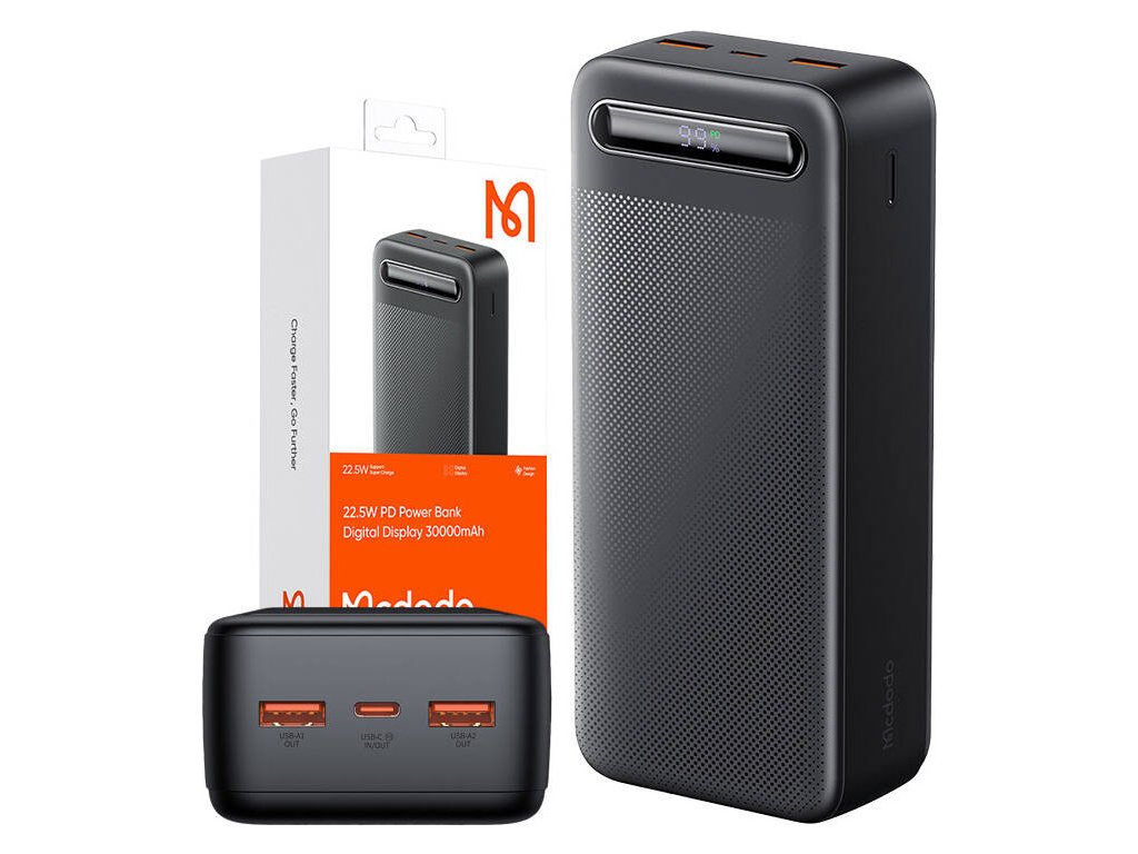 Powerbanka s kapacitou 30 000 mAh je ideálním řešením pro uživatele, kteří potřebují spolehlivý zdroj energie. Nabízí podporu pro širokou škálu protokolů rychlého nabíjení, což umožňuje rychlé a bezpečné nabíjení různých zařízení. S výstupním výkonem až 22,5 W a 20W PD pro iPhony poskytuje čtyřikrát rychlejší nabíjení ve srovnání s tradičními powerbankami. Digitální LED displej a víceúrovňová ochrana z ní navíc činí spolehlivé zařízení ideální pro dlouhé cesty.