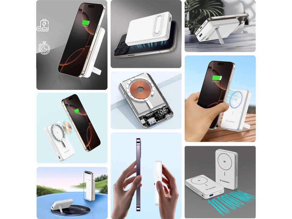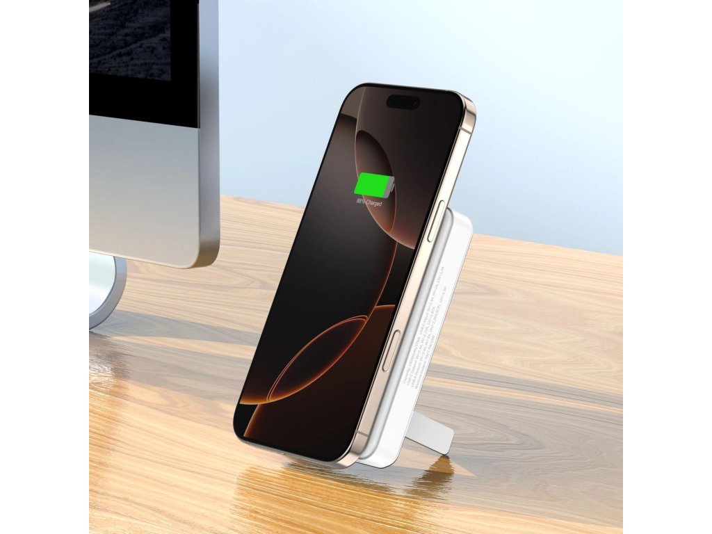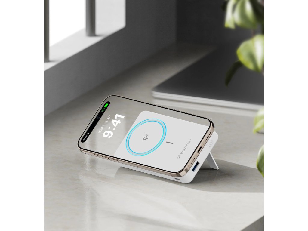 Powerbanka Wozinsky WLWP-10KA0Y3WS 22,5W PD Qi2 10000 mAh, se stojánkem, 1x USB-A, 1x USB-C - bílá