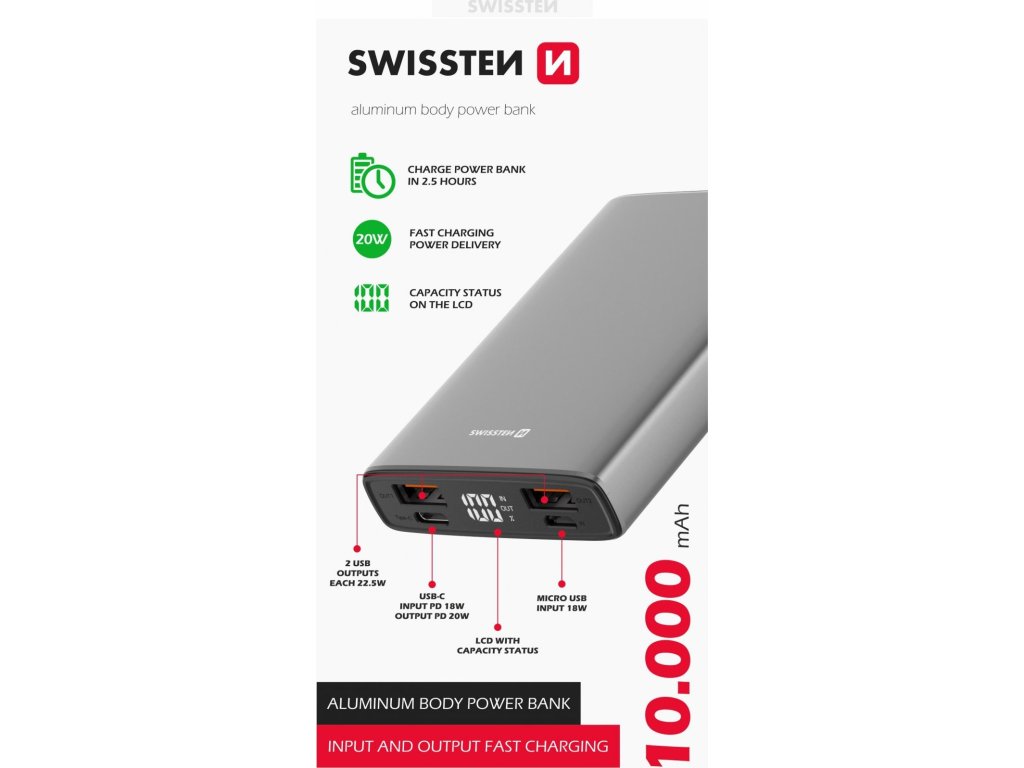 Hliníková powerbanka SWISSTEN a kapacitou 10.000mAh, vstupy microUSB a USB-C, výstupy 2xUSB-A, 1xUSB-C a rychlým dobíjením PD a QC. Baleno v blistru SWISSTEN.