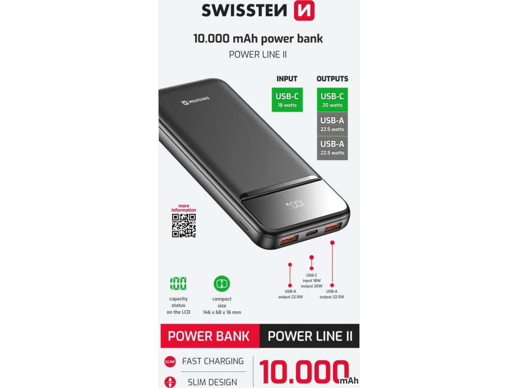 Powerbanka Swissten Power Line II 10.000 mAh, Max. výkon 22,5 Wattů, Porty výstupu: 2x USB-A / 1x USB-C, Váha: 235 gramů, Typ baterie: Li-polymer, Malé rozměry: (14,6 x 6,8 x 1,6 cm), Dobíjecí kabel v balení. Baleno v blistru Swissten.