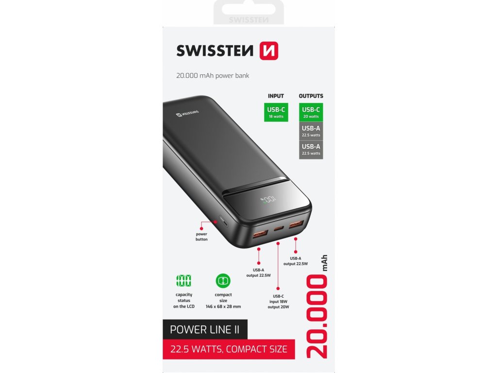 Hľadáte kvalitnú powerbanku, vďaka ktorej už nebudete musieť riešiť problémy s nedostatkom energie pre Vaše zariadenie? Našli ste správne! Power banka SWISSTEN s kapacitou 20.000 mAh, ktorá vás nenechá bez energie ani na cestách. Jej kompaktný dizajn a LED displej pre ľahkú kontrolu stavu batérie z nej robia praktického spoločníka na každodenné používanie. Navyše ponúka široké možnosti nabíjania vďaka viacerým výstupom a rýchlemu nabíjaniu.