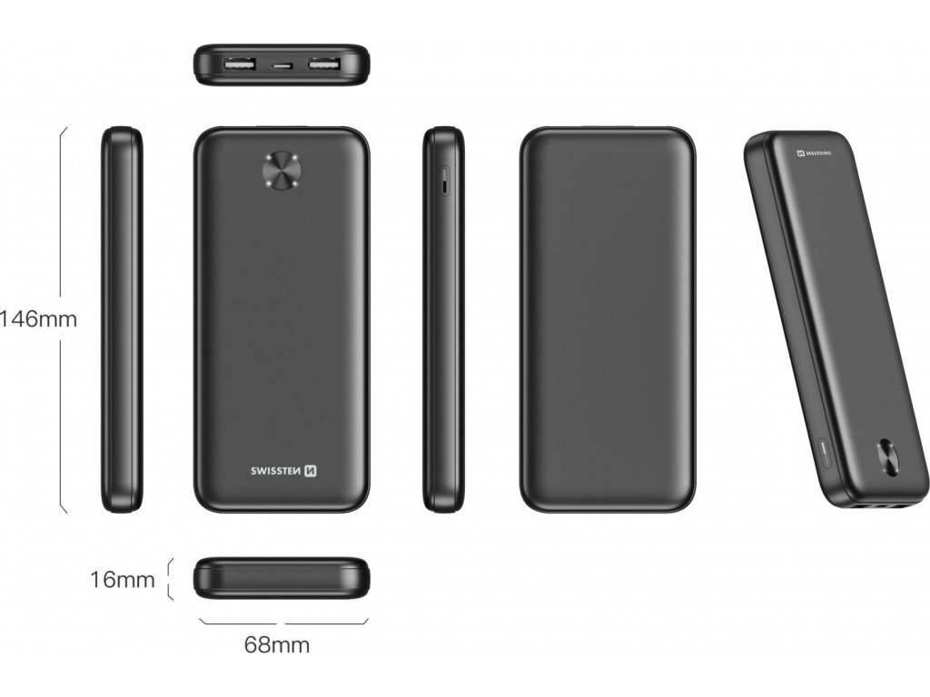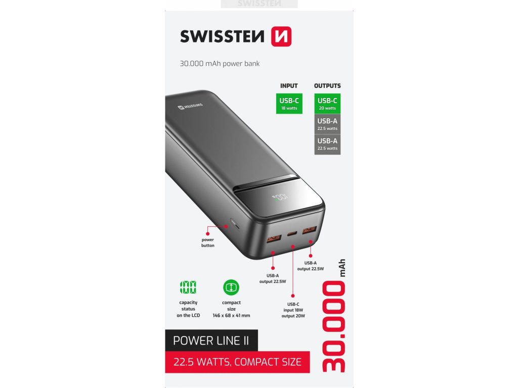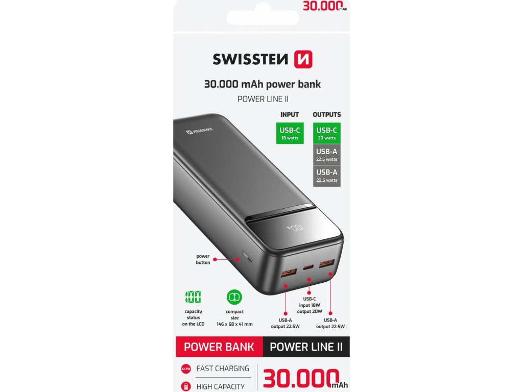 Powerbanka Swissten Power Line II 30.000 mAh, Max. výkon 22,5 Wattů, Porty výstupu: 2x USB-A / 1x USB-C, Váha: 603 gramů, Typ baterie: Li-polymer, Malé rozměry: (14,6 x 6,8 x 4,1 cm), Dobíjecí kabel v balení. Baleno v blistru Swissten.