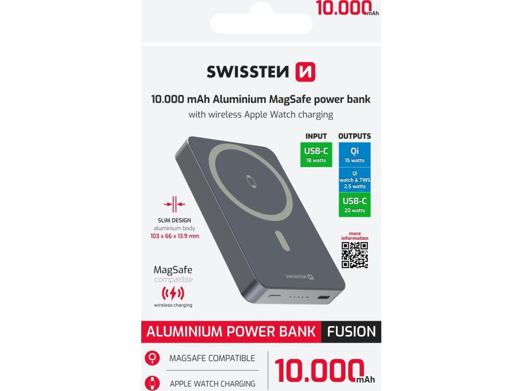 SWISSTEN hliníková MagSafe powerbanka FUSION, Kapacita: 10.000 mAh, Bezdrátové nabíjení až 15W, Nabíječka pro Apple Watch, USB-C výstup: 20W, Hmotnost: 190 g, Rozměry: 10.3 x 6.6 x 1.39 cm.