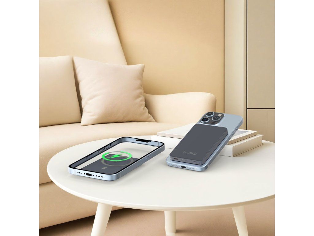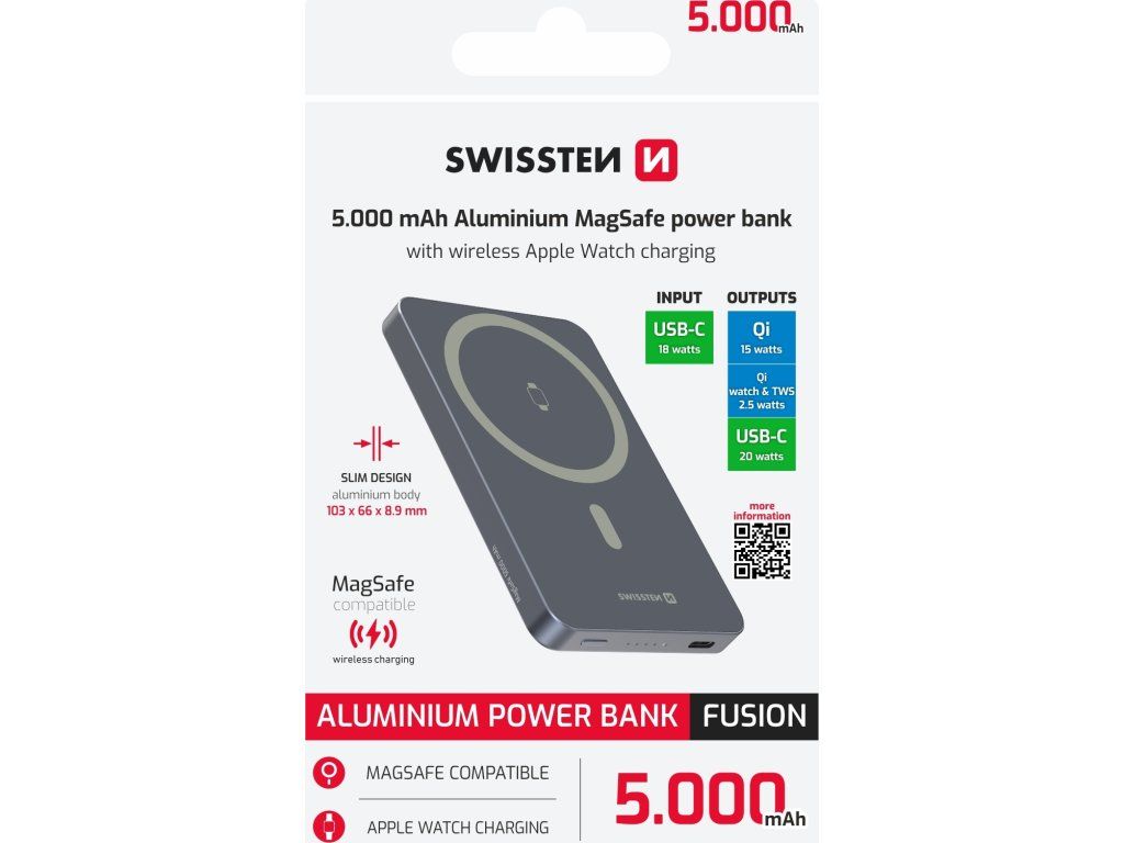 SWISSTEN hliníková MagSafe powerbanka FUSION, Kapacita: 5000 mAh, Bezdrátové nabíjení až 15W, Nabíječka pro Apple Watch, USB-C výstup: 20W, Hmotnost: 115 g, Rozměry: 10.3 x 6.6 x 0.89 cm.