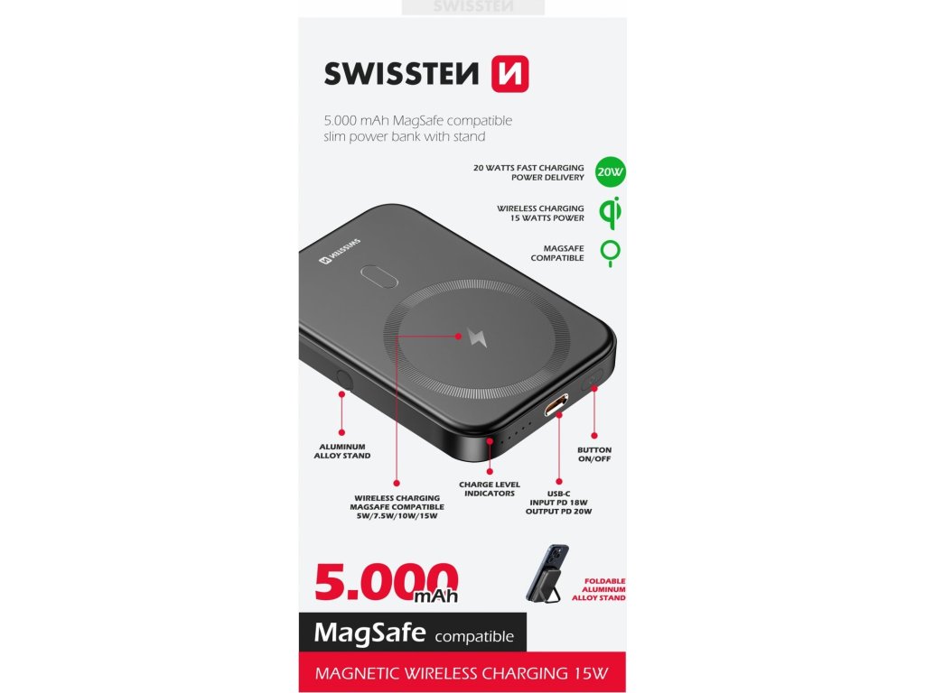 Powerbanka Swissten MagSafe 5000 mAh, Max. výkon 20 Wattů, 1x USB-C / 1x Qi bezdrátové nabíjení, Hliníkový stojánek, Typ baterie: Li-polymer, Malé rozměry: (96 x 66 x15 mm) Baleno v blistru Swissten.