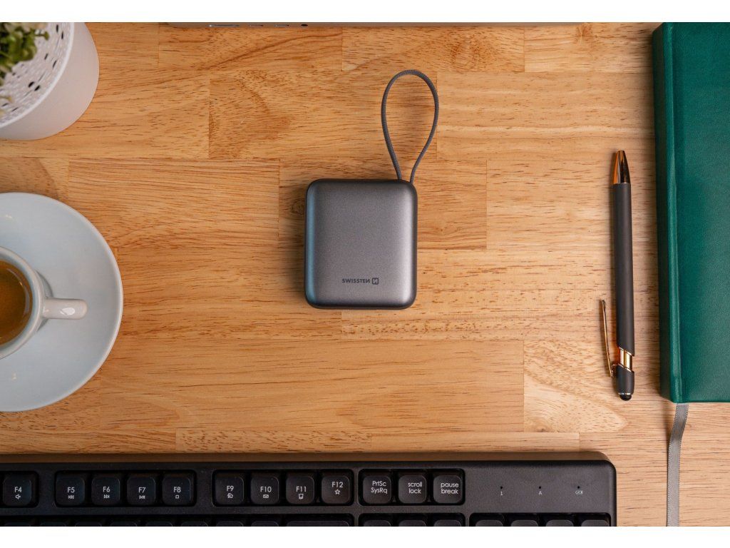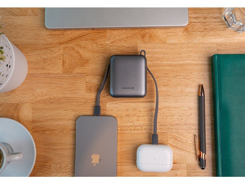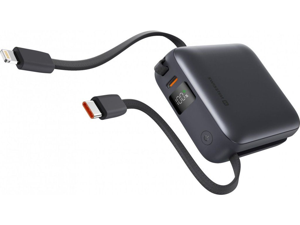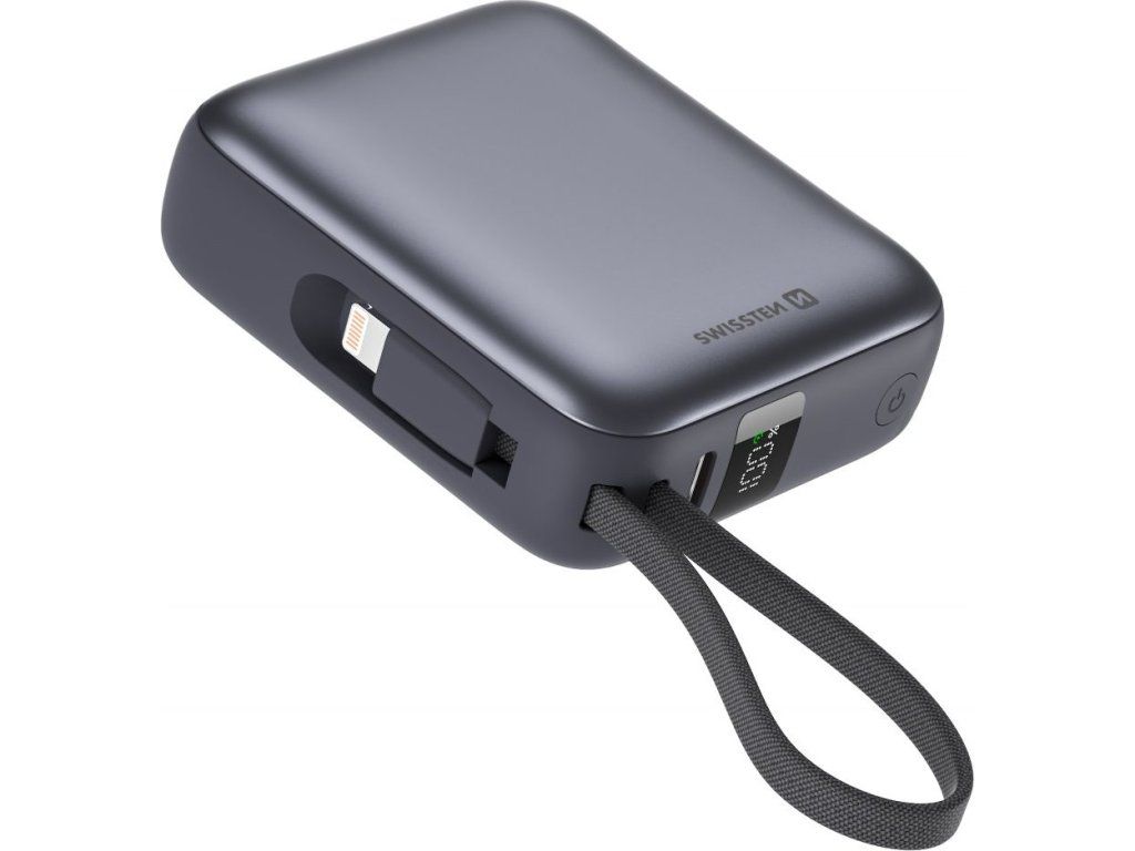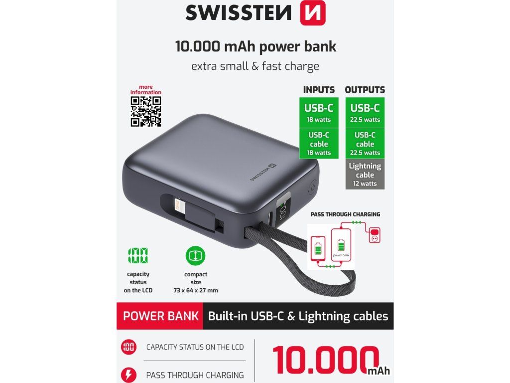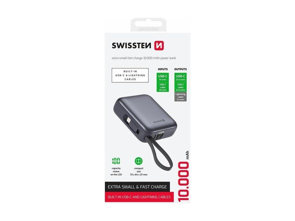 Powerbanka Swissten 10000 mAh s integrovanými kabely USB-C + Lightning, Výstupní port: USB-C, Max. výkon 22.5W, Váha: 175 g, Typ baterie: Li-Polymer, Malé rozměry: (7,3 x 6,4 x 2,7 cm). Baleno v blistru Swissten.